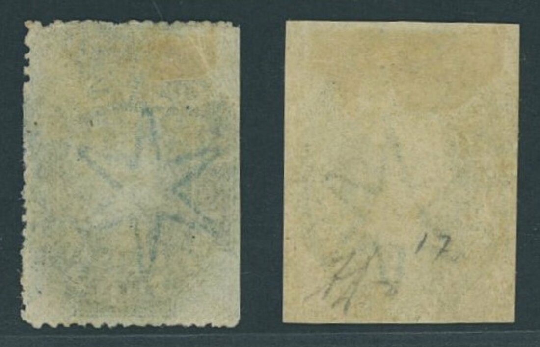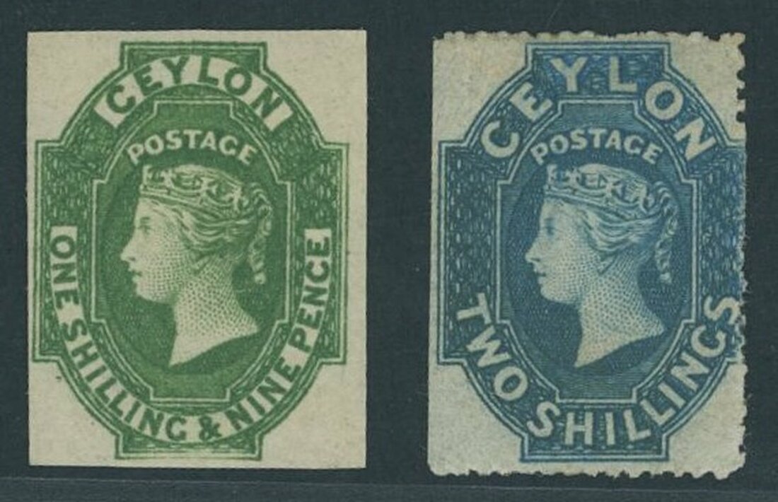 1857-59 Watermark Star 1/9d. green, good clear margins and part original gum; also 1861-64 Watermark Star rough perf. 14 to 15½ 2/- dull blue, with straight edge at left, part original gum. B.P.A. Certificate (1984) for 1/9d. S.G. 11, 37, £1,800