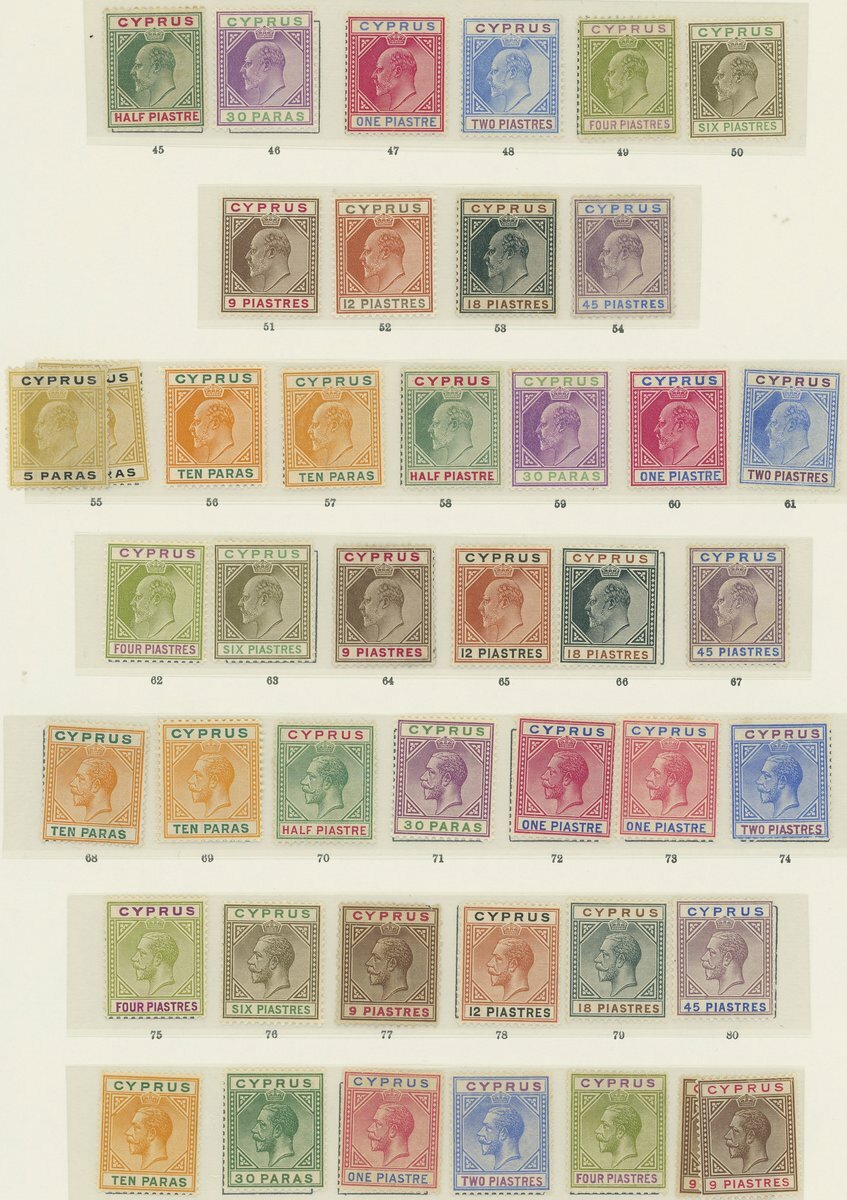 1880-1935 mint collection on pages including 1880 ½d., 1d., 2½d., 4d., 6d. and 1/-, ½d. on 1d. (2) and 30p. on 1d., 1881 CC ½pi to 6pi (4pi with Diena Certificate), 1882 and 1886 "½" on ½pi., 1882-76 CA Die I set to 12pi., 1892-94 Die II set to 12pi., 1894-96 set to 45pi., 1902-04 set to 45pi., 1904-10 MCA set to 45pi., 1912-15 MCA set to 45pi., 1924-28 MCA £1 and Script set to £5, 1928 set to £1, 1934 Script set to 45pi. etc; good to fine. S.G. cat. value £14,000+