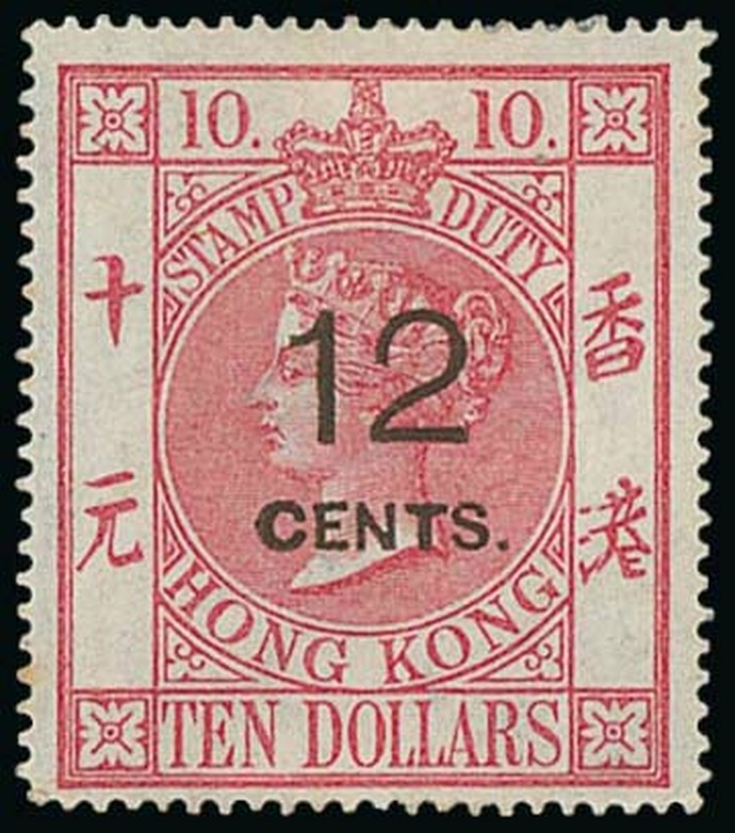 1880 Fiscal 12c. on $10 rose-carmine, large part original gum; fine. S.G. F7, £1,000