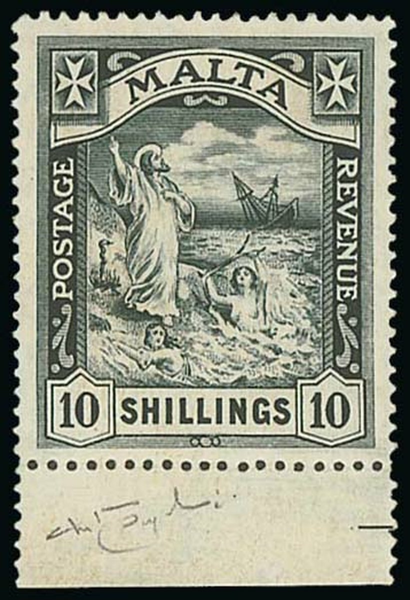 1919 MCA 10/- black from the foot of the sheet, very fine with large part original gum. Signed Raybaudi in the margin in pencil and with his Certificate (2000). S.G. 96, £3,250