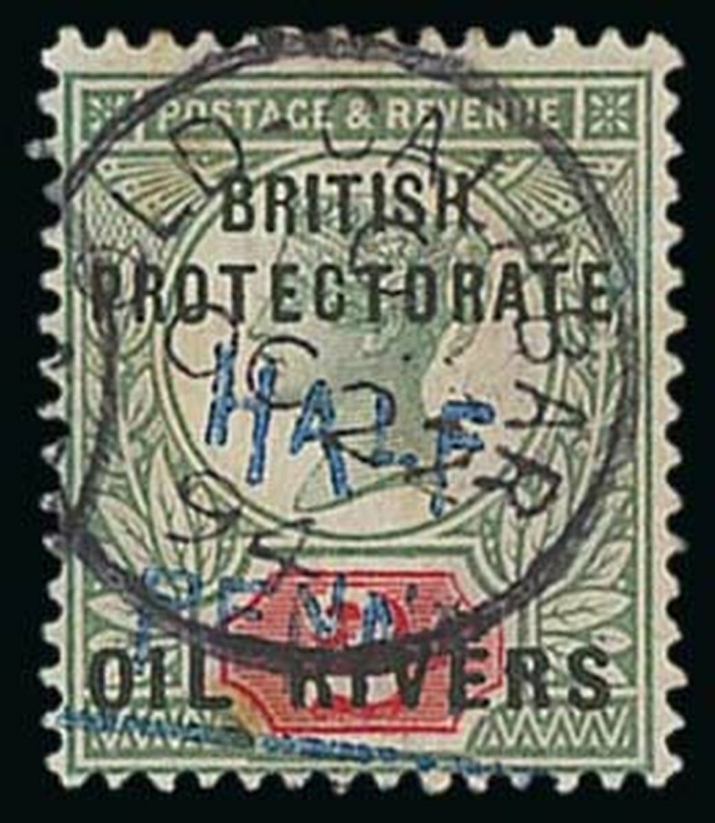 ½d. on 2d. grey-green and carmine, surcharged Type 9 in blue, used with almost complete Old Calabar c.d.s., colours slightly suffused, still a good example. B.P.A. Certificate (2010). S.G. 30, £850