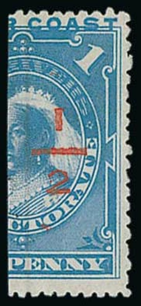 '½' in red on half of 1d. pale blue, bisected vertically, light vertical pencil mark that was put on as a guideline for the bisecting; diagonal crease, large part original gum. Holcombe Opinion (1996). S.G. 58, £1,200