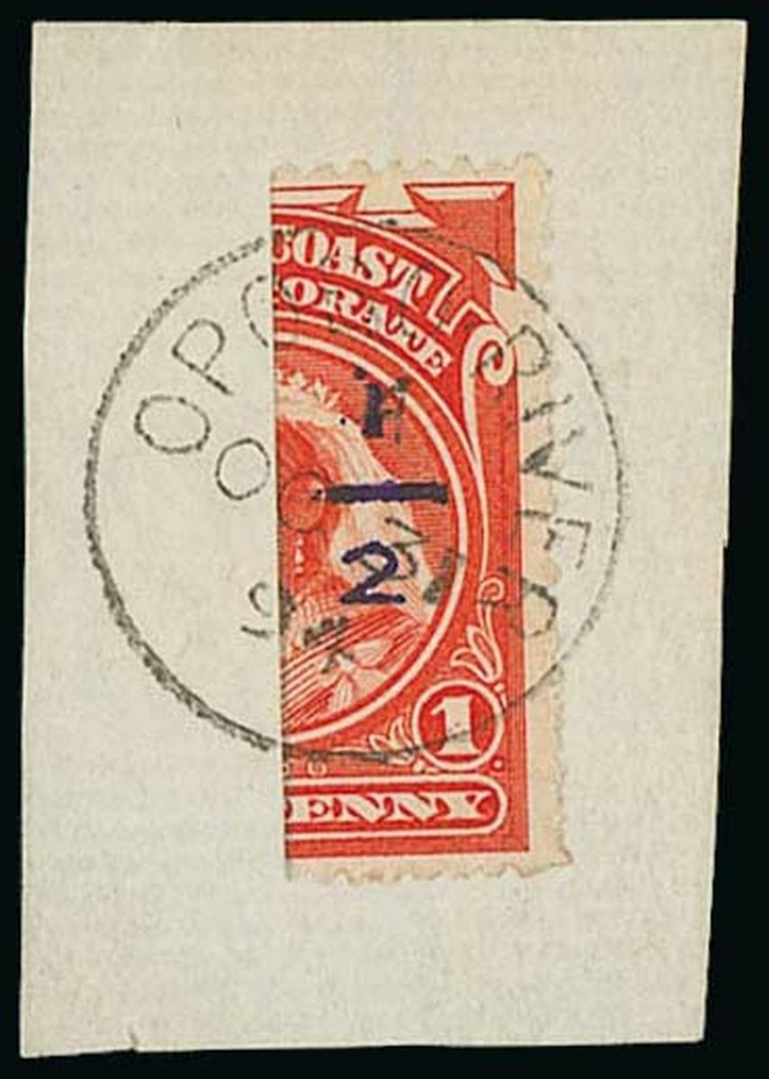 "½" in violet on half of 1d. orange-vermilion, used and tied to piece by
