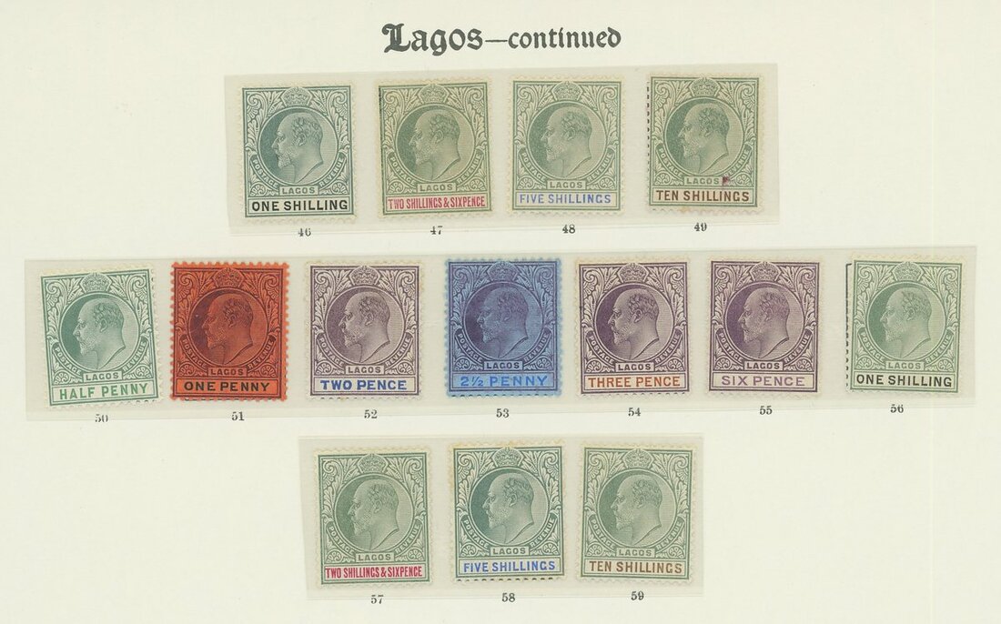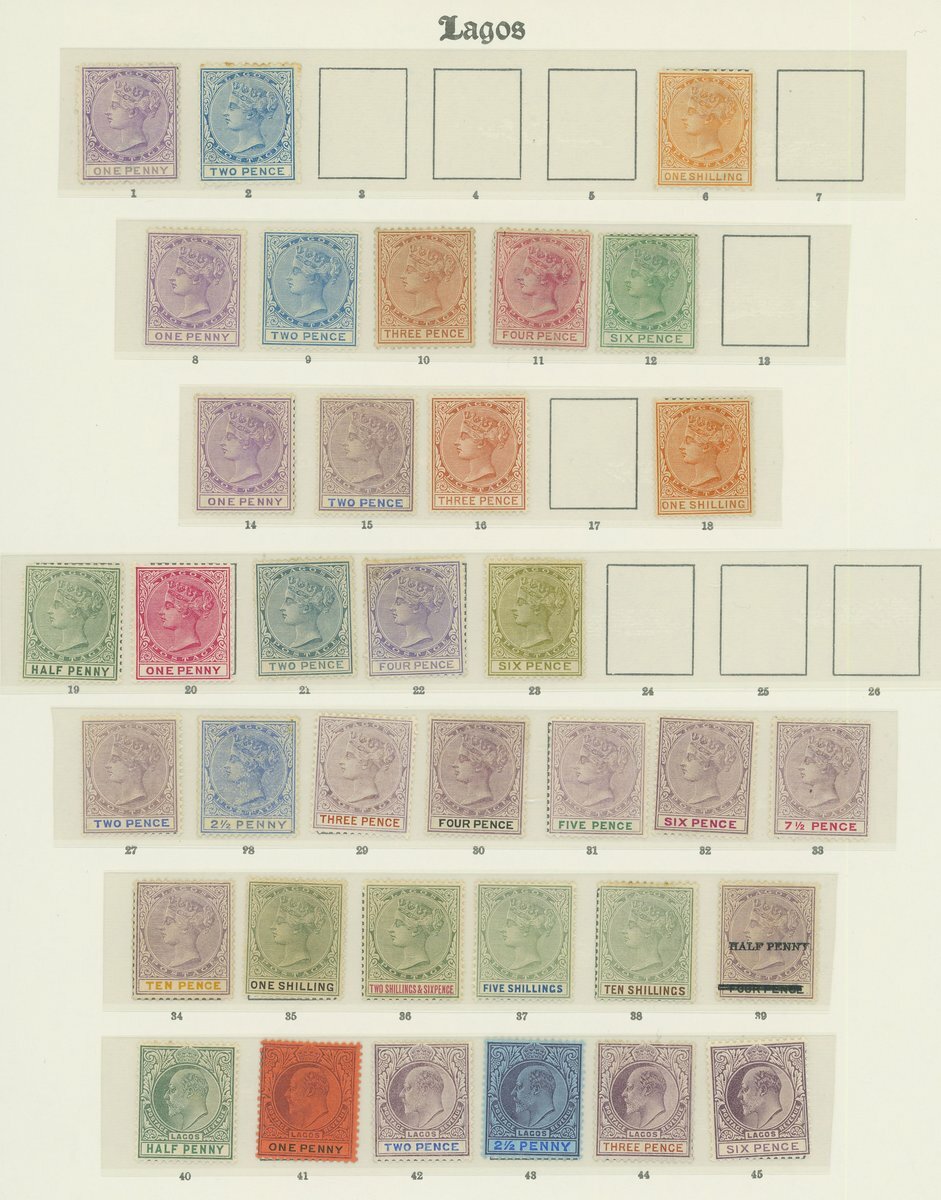 1874-1935 mint collection including Lagos 1874-75 CC 1d., 2d. and 1/-, 1876-79 CC 1d. to 6d., 1884-86 CA with 1d., 2d., 3d. and 1/-, 1887-102 set to 10/-, 1904 CA and 1904-06 MCA sets to 10/-, Niger Coast Protectorate with 1892-94 set to 1/-, 1893 ½d. on 1d. dull lilac unsevered pair, 1893 ½d. Provisionals including on 2d. grey-green and carmine (Type 3 in violet), on 2½d. purple on blue (Type 6 in vermilion, Type 8 in green, BPA Cert., Type 9 in blue and Type 10 in green), 1894 set to 1/-, 1897-98 set to 10/-, Northern Nigeria with 1900 CA set to 10/-, 1902 CA set to 10/-, 1905-07 set to 2/6d., 1910-11 set to 10/-, 1912 set to £1, Southern Nigeria with complete sets to 1912, Nigeria with 1914-29 set to £1, 1921-32 set to 10/- (both 10/-), 1936 set to £1, etc. good to fine