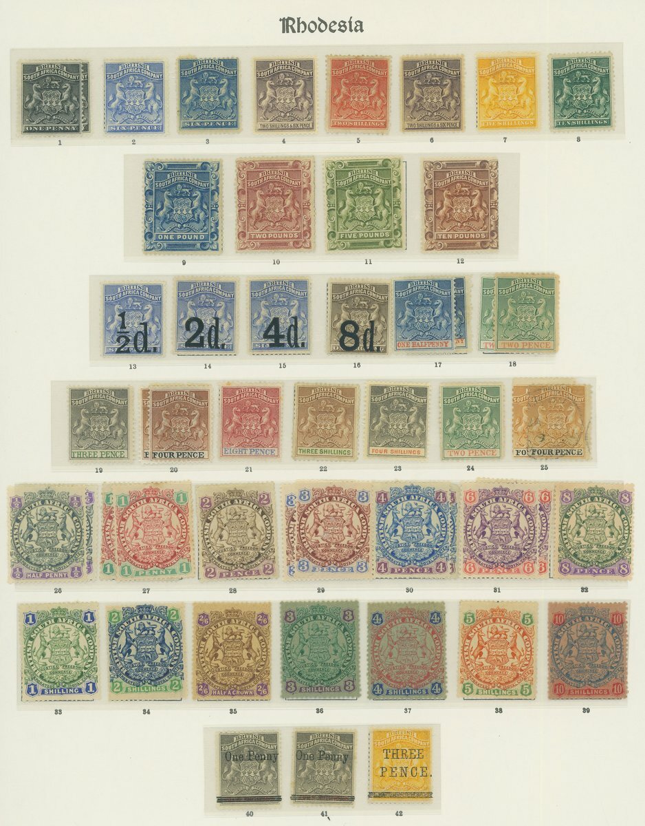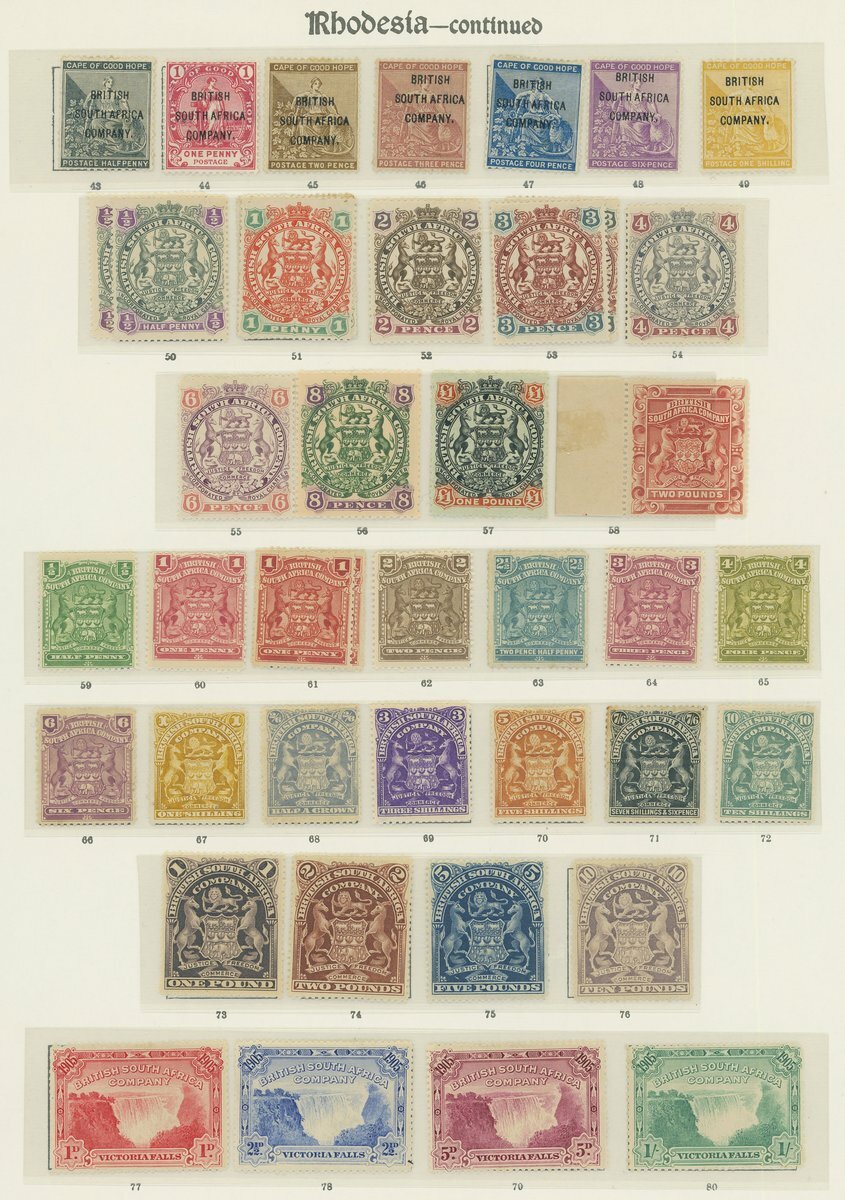 1892-1924 mint collection on album pages including 1892 Arms 1d. to £10, 1892 surcharge set of four, 1892-94 set to 4/-, 1896-97 set to 10/-, 1896-97 Matabele provisional set of three, 1896 Cape overprint set, 1897 set to £1, 1897 £2 rosy red (Brandon Cert.), 1898-1908 set to £10, 1905 Victoria Falls set, 1909-12 set to £1, 1910-13 Double Heads to £1 ( with two £1 values), 1913-24 Admirals to £1, Southern Rhodesia with all sets to 5/-; some with tone spots in places but generally good to fine and a valuable collection. S.G. cat. value £30,000+