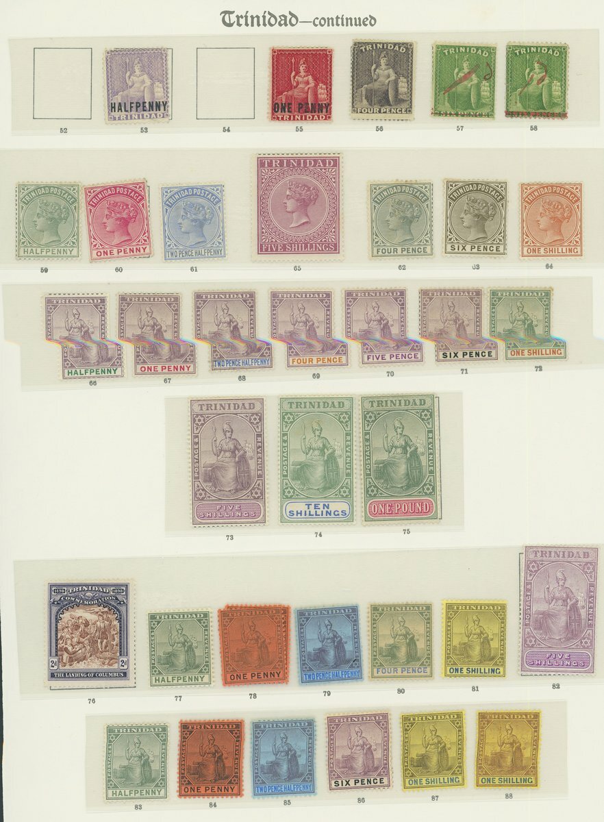 1851-1935 mint collection on album pages including Britannia issues with 1851-55 first issue blued paper 1d. mint (9, various shades) and used as well as a block of thirty of 1d. purple-brown and corner block of four of the 1d. blue, 1854-57 white paper 1d. dark grey, 1859 4d. grey-lilac and 1/- indigo, 1863-80 with values to 1/-, 1869 CC 5/- rose-lake, 1896-1906 set to £1, 1904-09 set to £1, Postage Dues, Officials etc., Tobago with set to £1 and also some surcharges, Trinidad and Tobago with 1913 and 1922 sets to £1, etc. generally good to fine