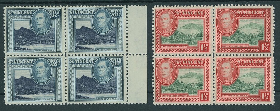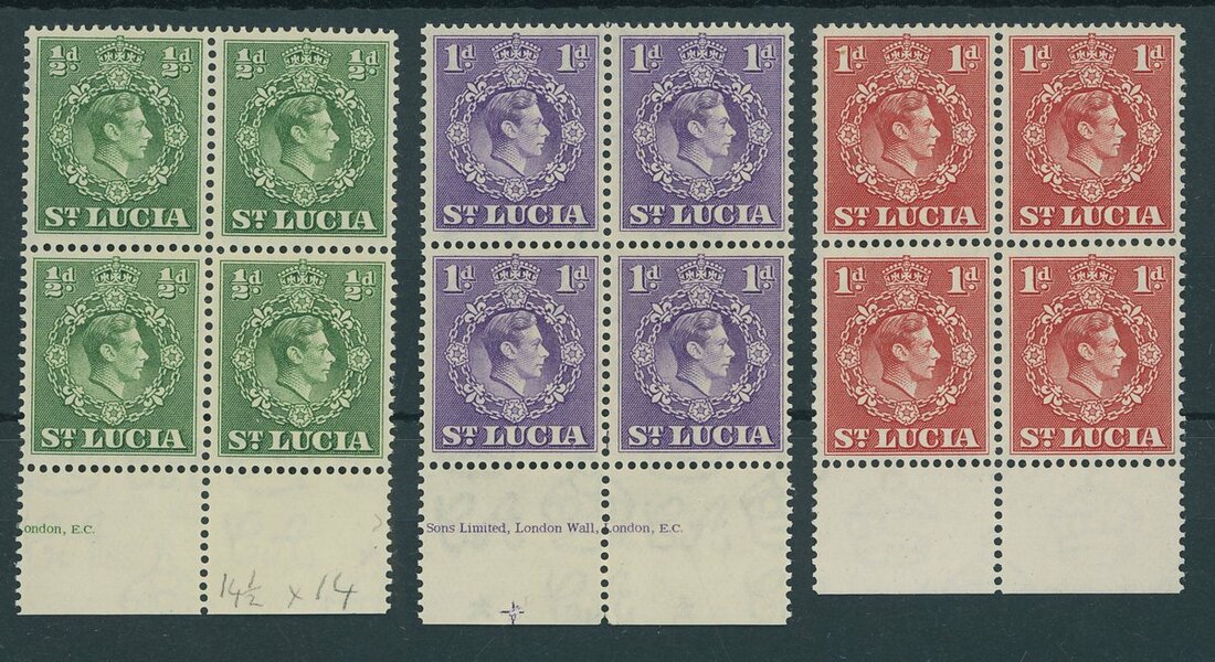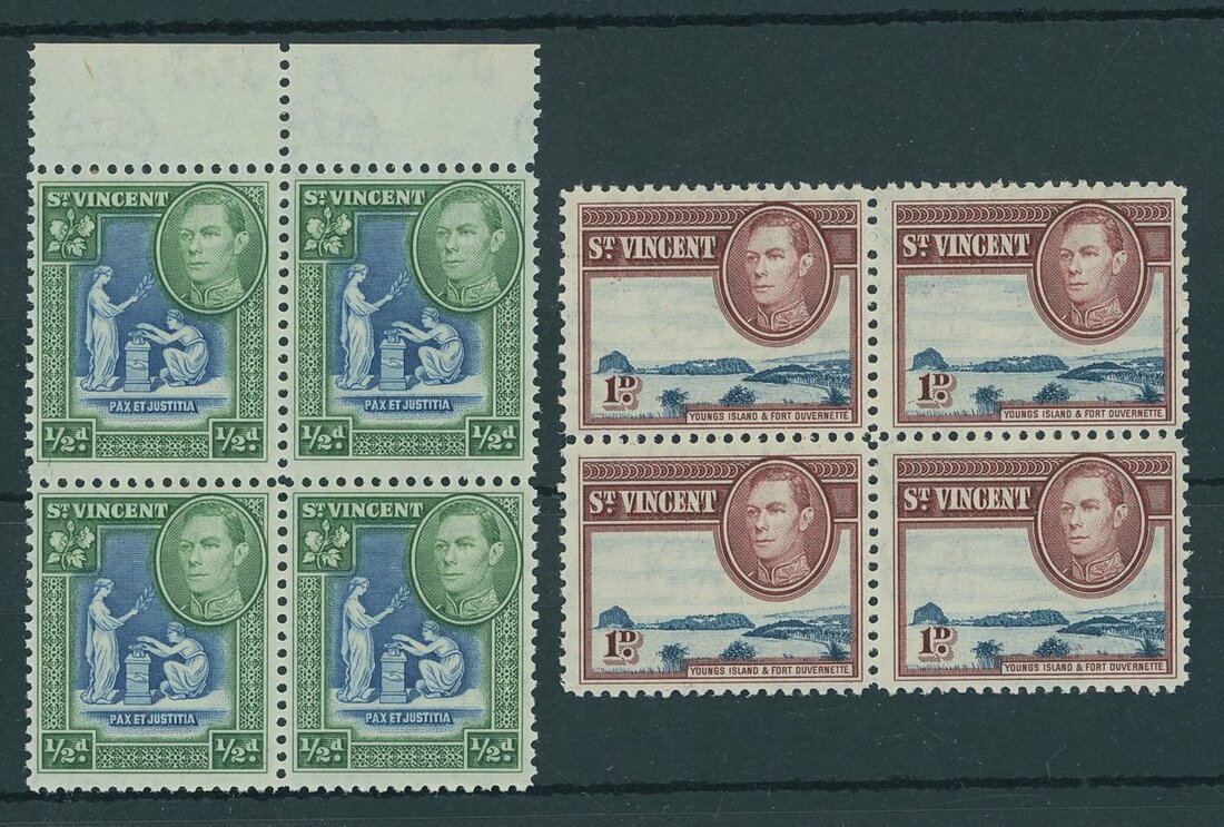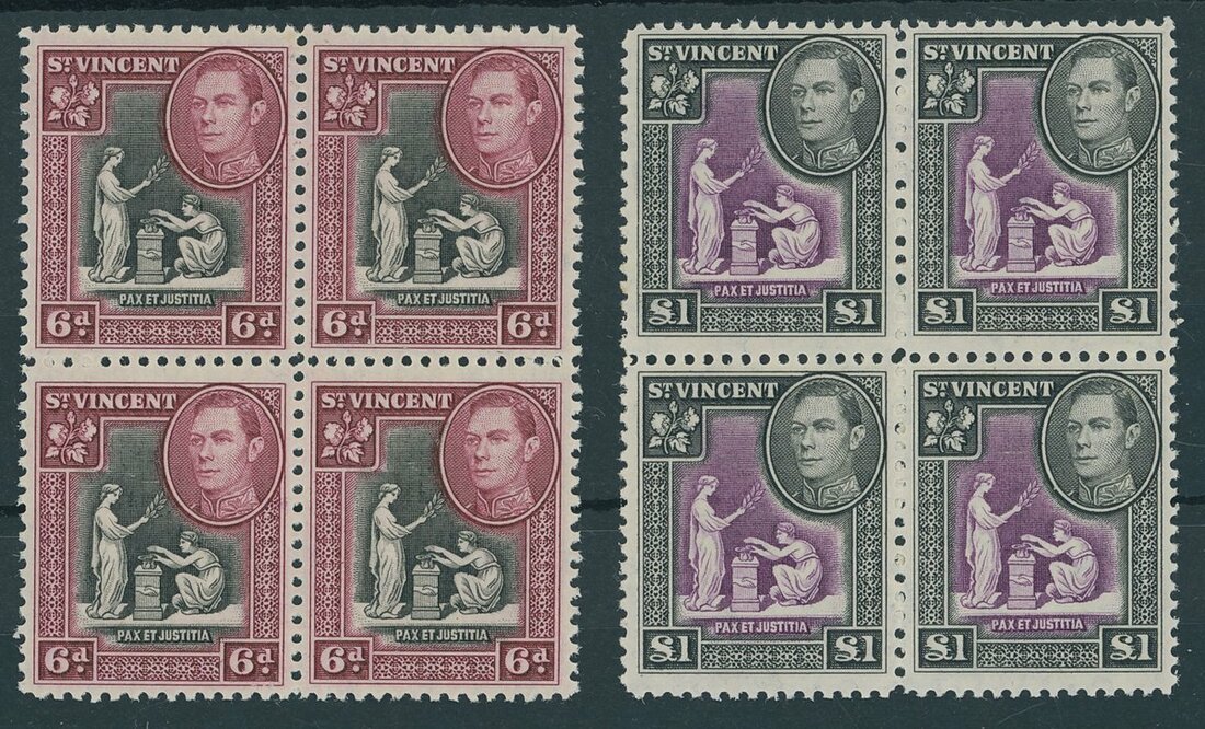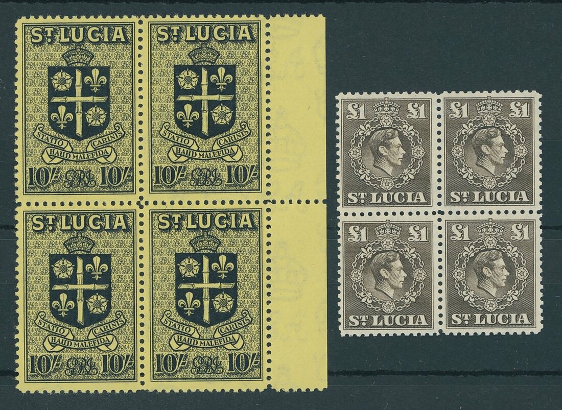 A group of King George VI sets all in mint blocks of four comprising Bahamas 1948 ½c. to £1 in corner blocks of four, Mauritius 1950 set to 10r. in corner blocks of four, St. Lucia 1938-48 set to £1 in blocks of four with shades and duplication, St. Vincent 1938-47 set to £1 and Turk and Caicos 1950 set to £1 in marginal blocks; fine and fresh min. S.G. £1,800+