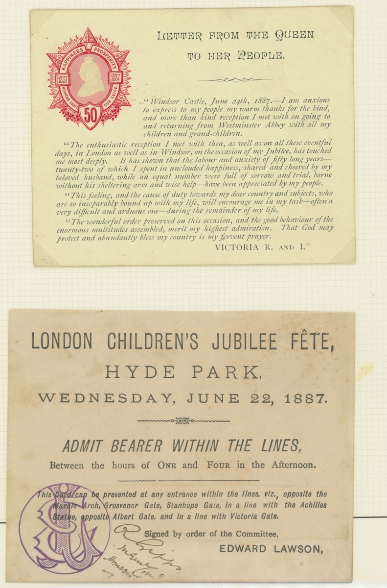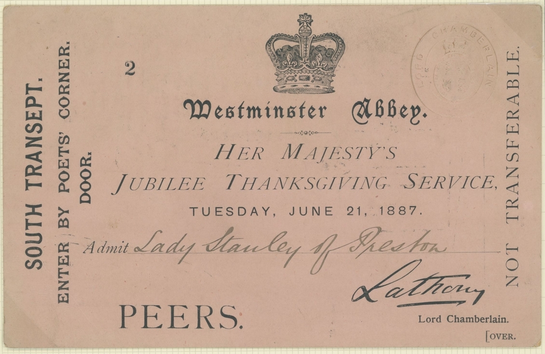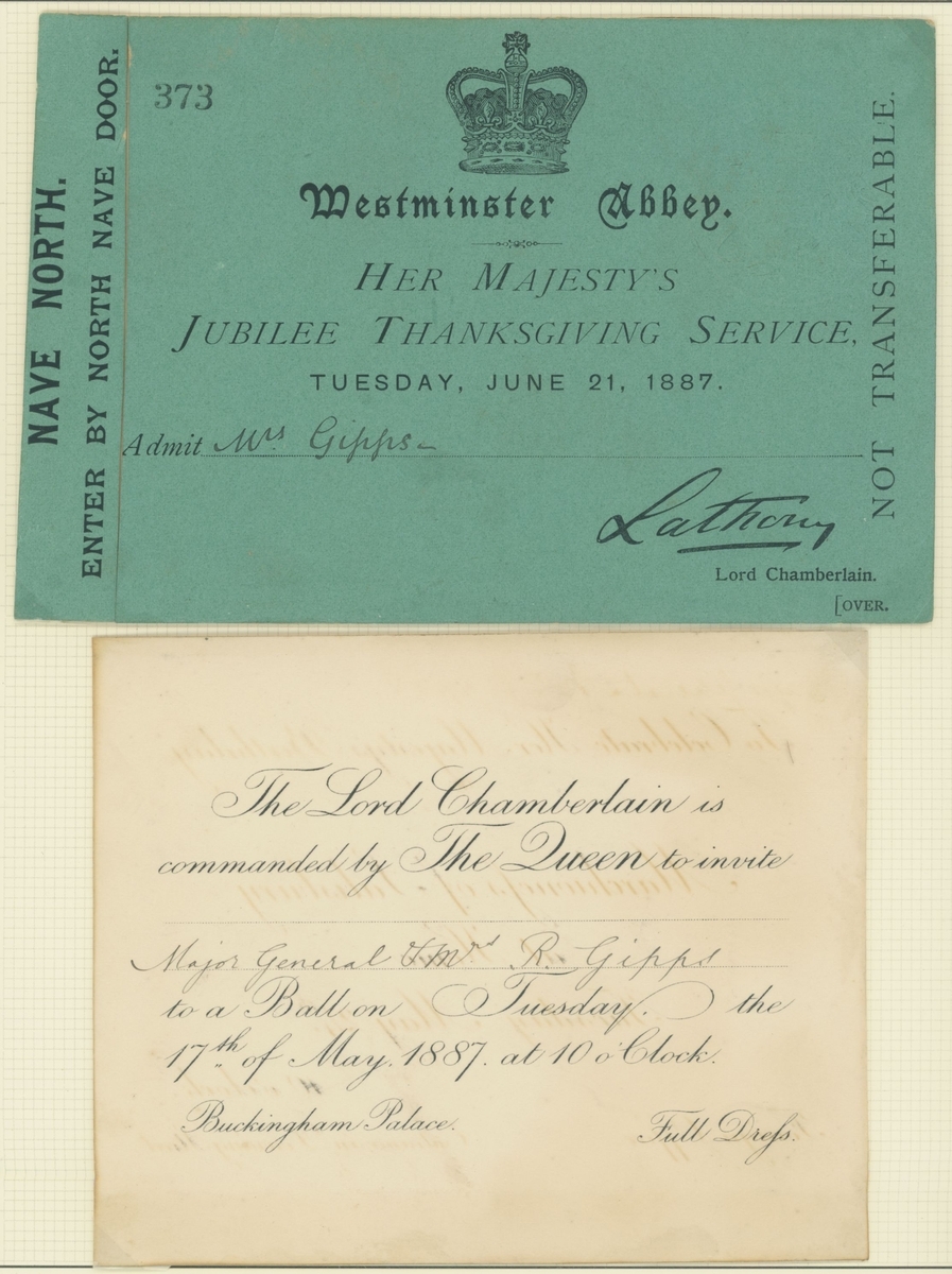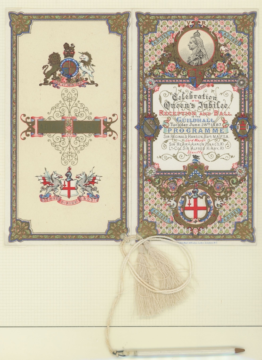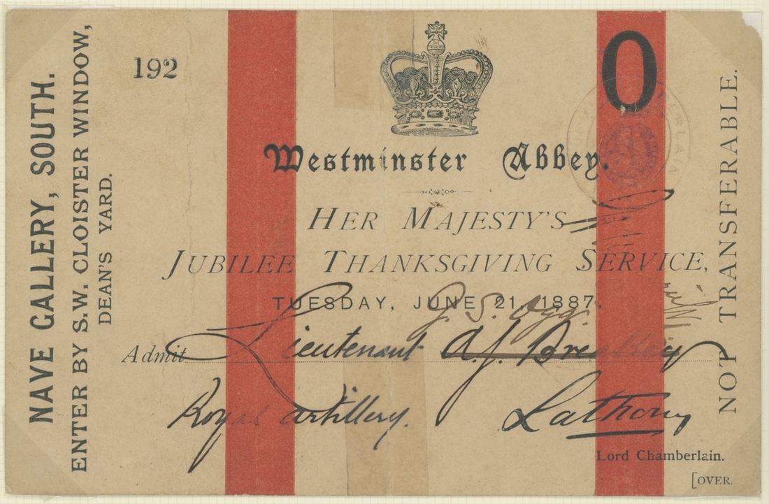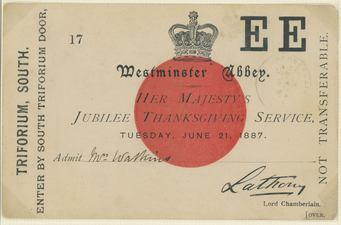 1887 Golden Jubilee. Six admission tickets to the Jubilee Thanksgiving Service at Westminster Abbey, the guest name on one amended the day before by the Commander in Chief, Portsmouth, whose cachet appears on the ticket, with various printed advertising and souvenir items, the dance card for the Guildhall celebration, decorative invitation to the reception and ball there (28.5x36,5cm), and an unusual leaflet by the "Anti Jubilee Committee" (30)