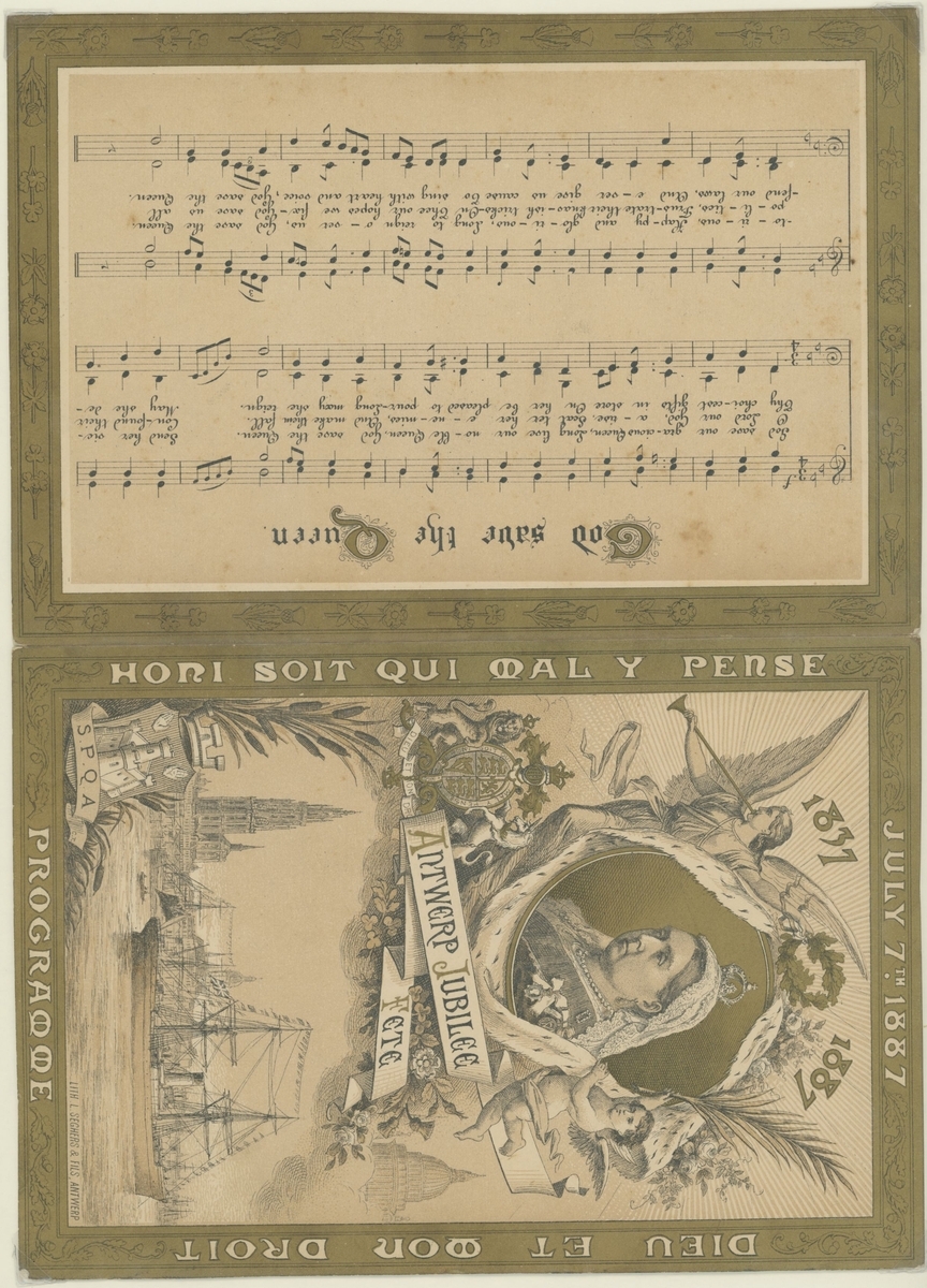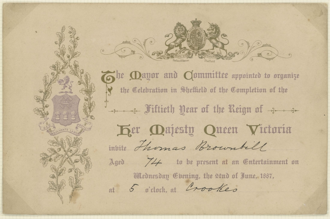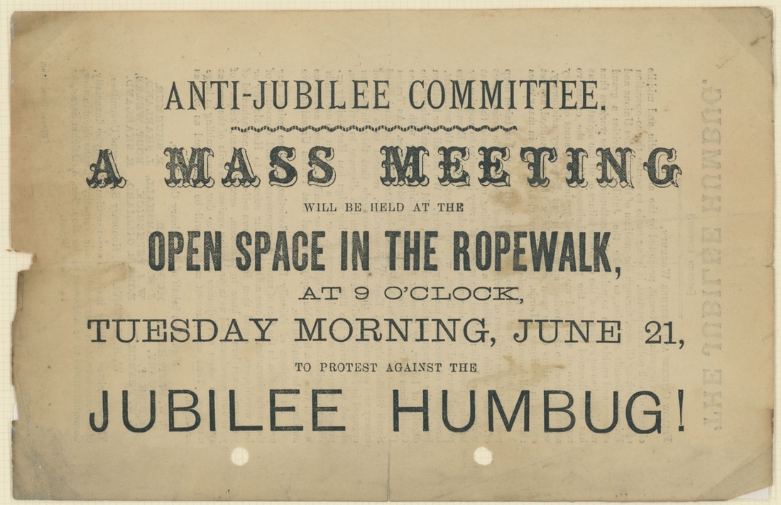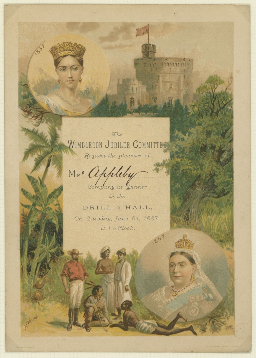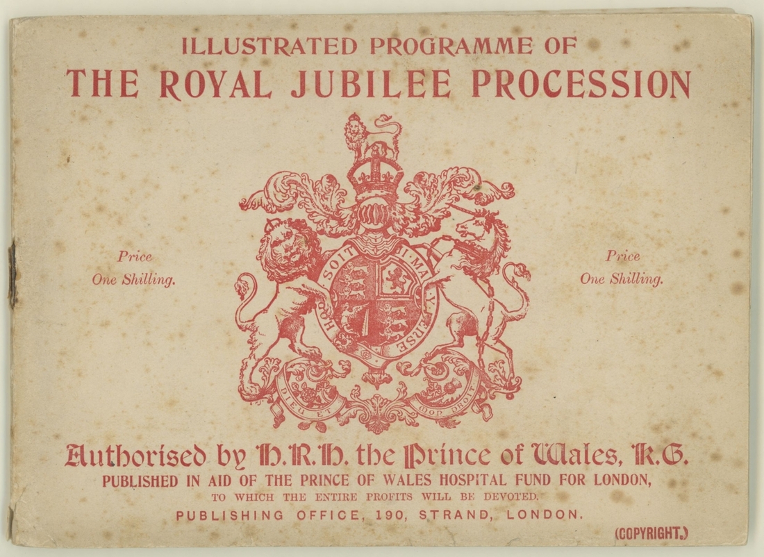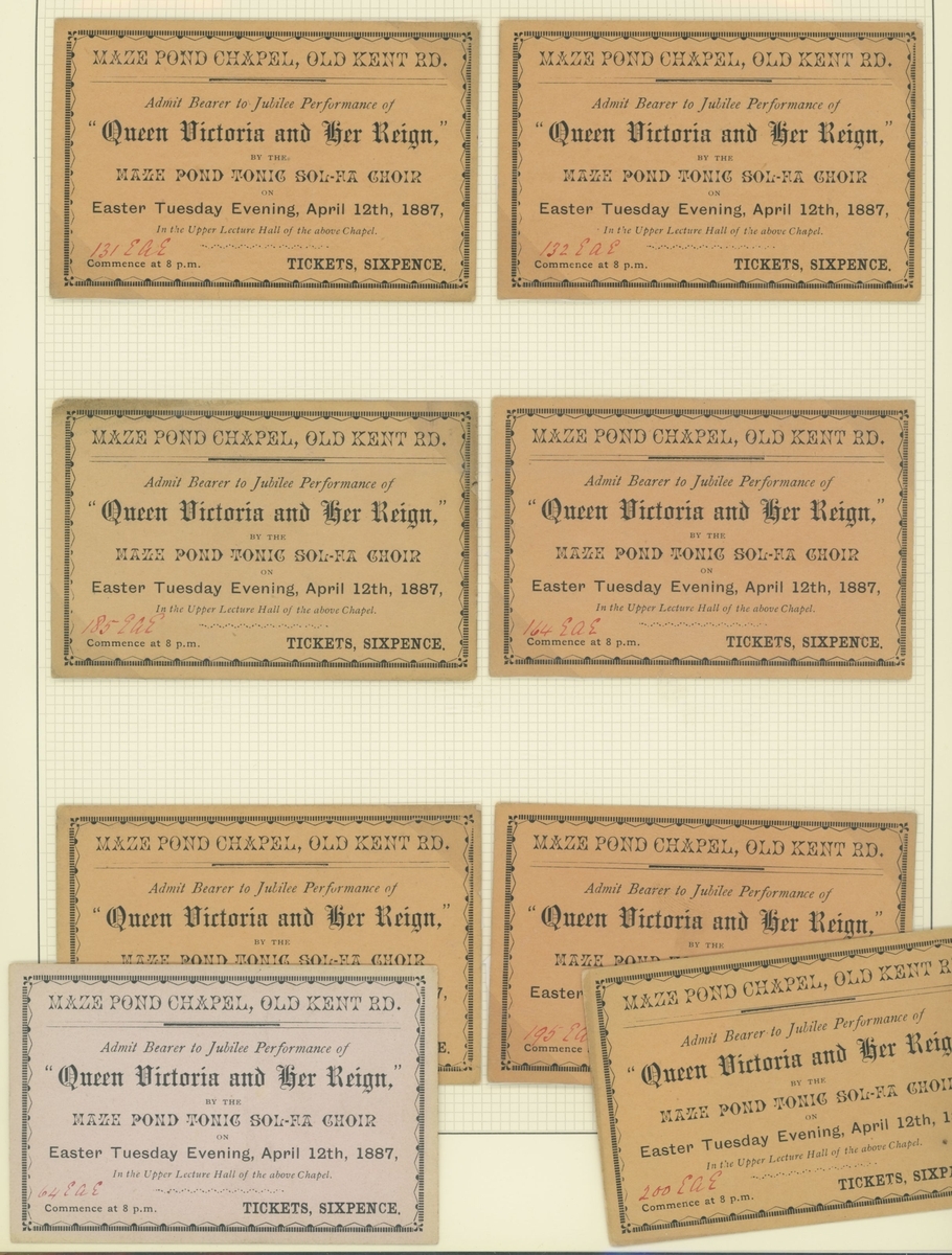 1887 Golden Jubilee. Six admission tickets to the Jubilee Thanksgiving Service at Westminster Abbey, the guest name on one amended the day before by the Commander in Chief, Portsmouth, whose cachet appears on the ticket, with various printed advertising and souvenir items, the dance card for the Guildhall celebration, decorative invitation to the reception and ball there (28.5x36,5cm), and an unusual leaflet by the "Anti Jubilee Committee" (30)