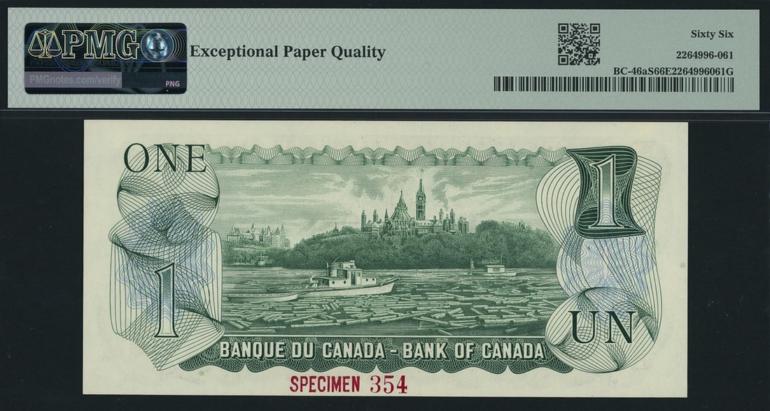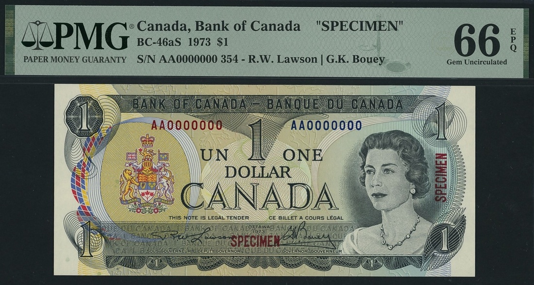 (x) Bank of Canada, specimen 1 Dollar, 1973, serial number AA0000000 354, (Pick 85s, BC-46as), in PMG holder 66 EPQ Gem Uncirculated