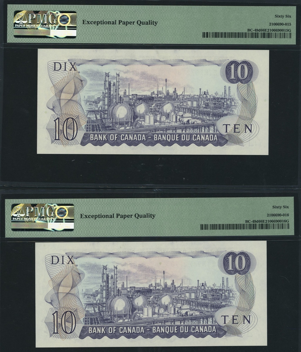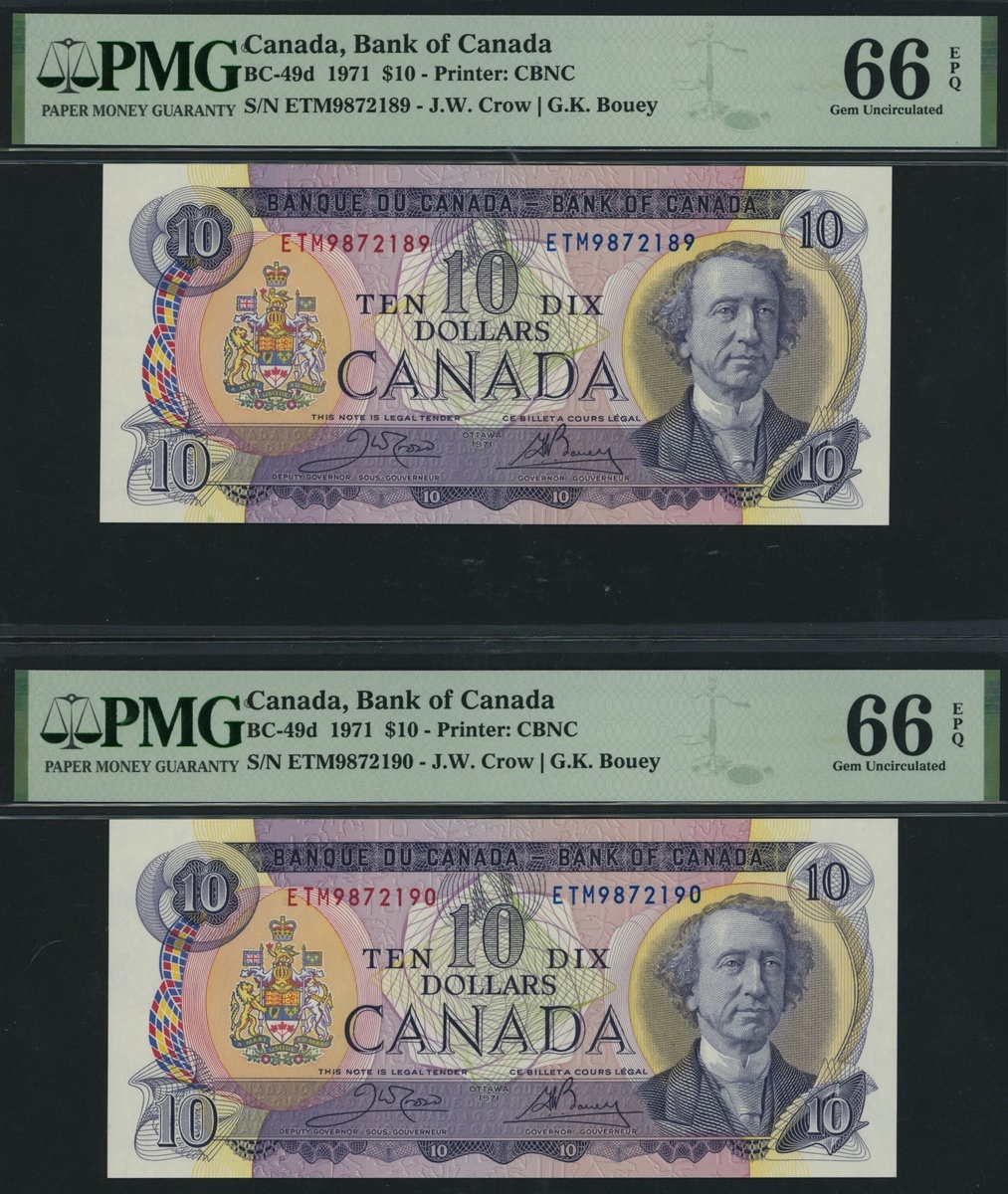Bank of Canada, [2 notes], consecutive pair of $10, 1971, serial numbers ETM9872189, 90, (Pick 88, BC-49d), both in PMG holders 66 EPQ Gem Uncirculated (2 notes)