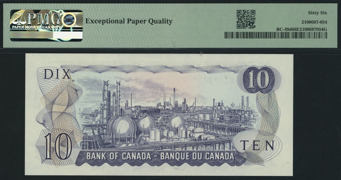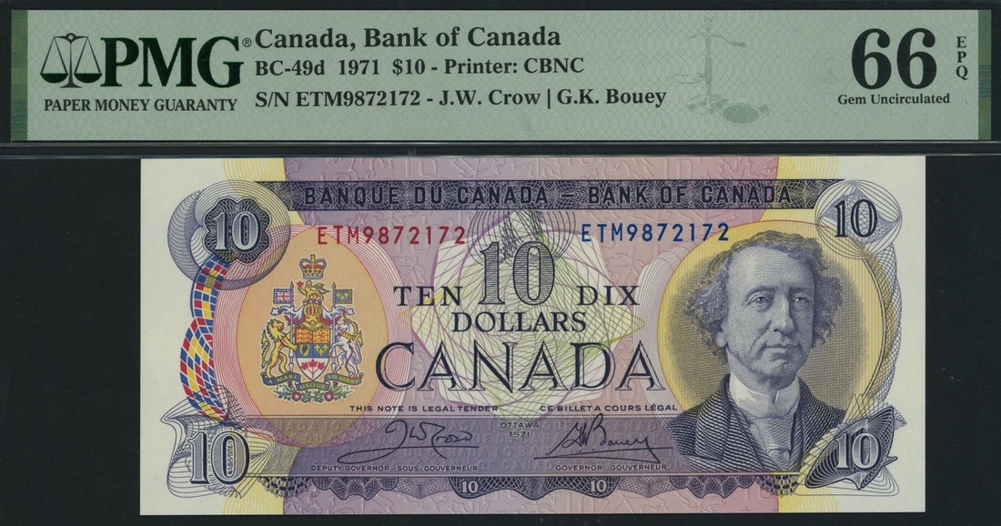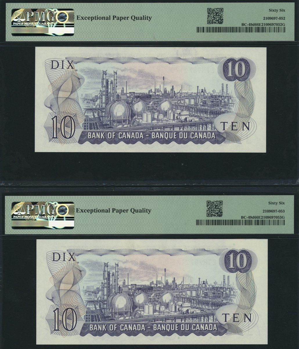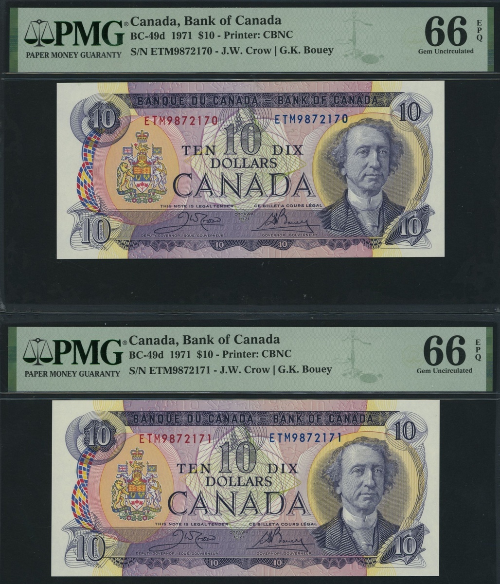 Bank of Canada, [3 notes], consecutive set of $10, 1971, serial numbers ETM9872170, 71, 72, (Pick 88, BC-49d), all in PMG holders 66 EPQ Gem Uncirculated (3 notes)