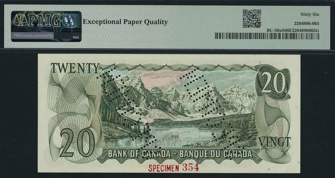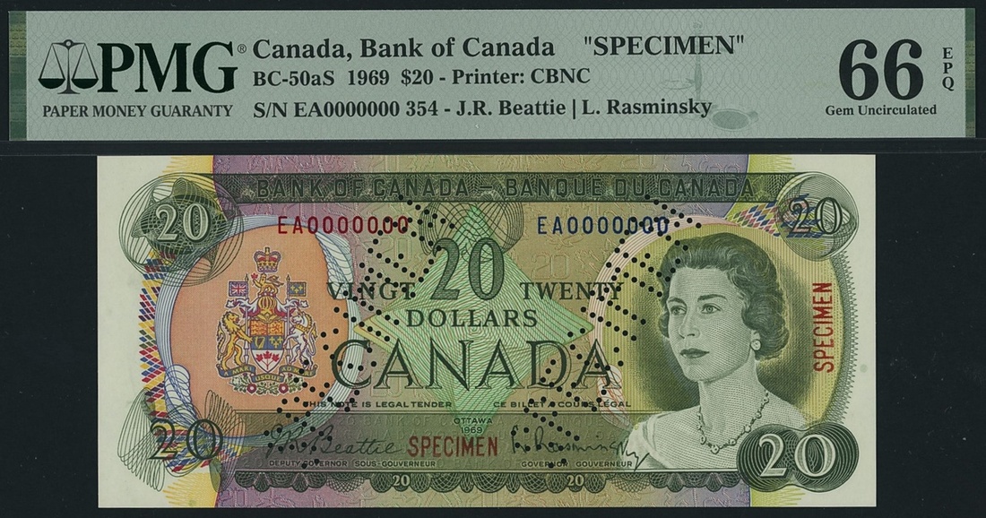 (x) Bank of Canada, specimen $20, 1969, serial number EA0000000 354, (Pick 89s, BC-50aS), in PMG holder 66 EPQ Gem Uncirculated