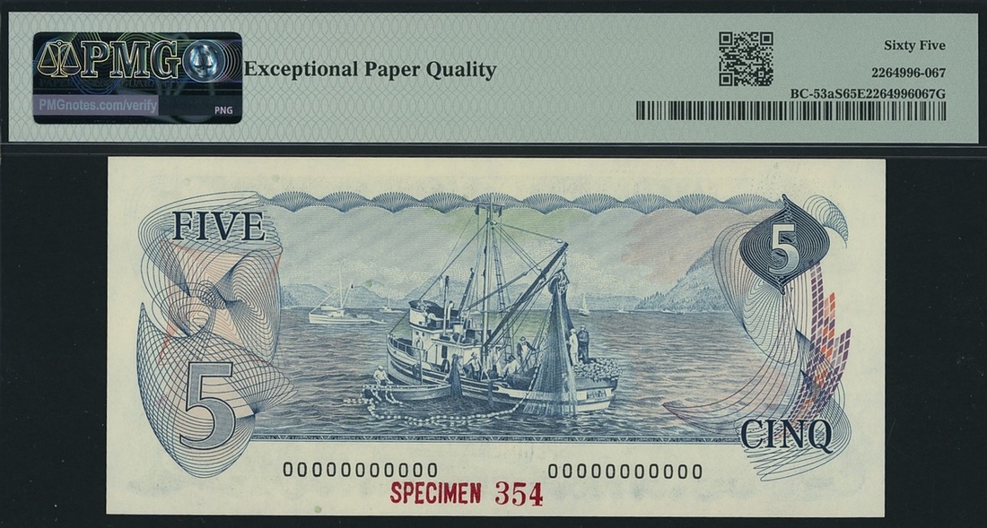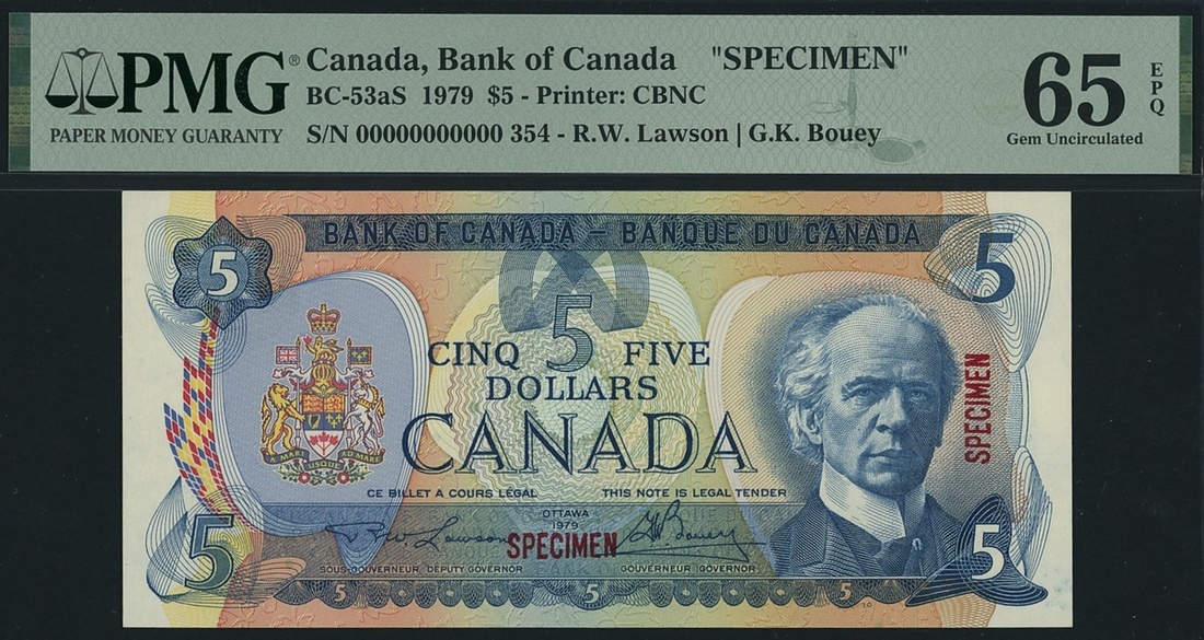 (x) Bank of Canada, specimen 5 Dollars, 1979, serial number 00000000000 354, (Pick 92s, BC-53aS), in PMG holder 65 EPQ Gem Uncirculated
