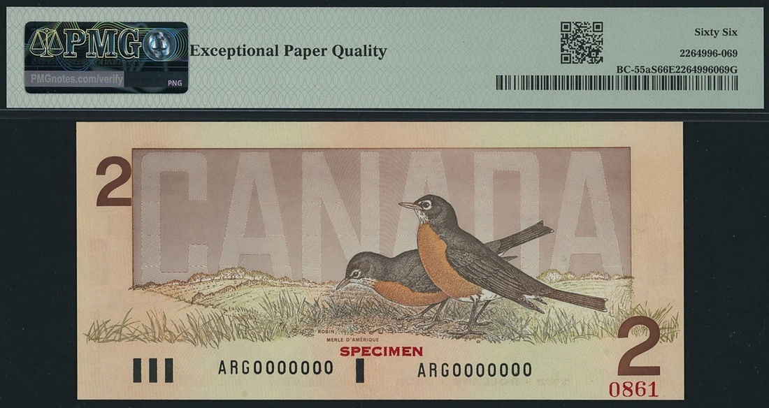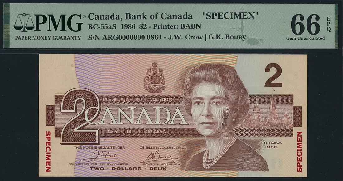 (x) Bank of Canada, specimen 2 Dollars, 1986, serial number ARG0000000 0861, (Pick 94s, BC-55aS), in PMG holder 66 EPQ Gem Uncirculated