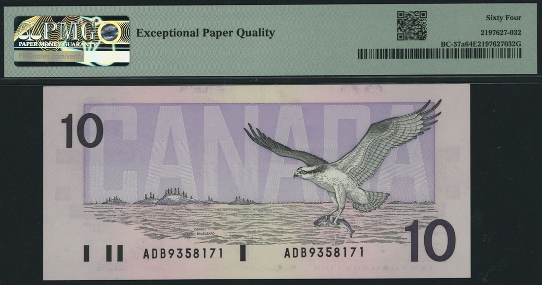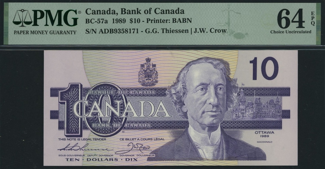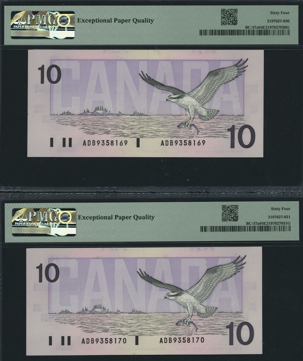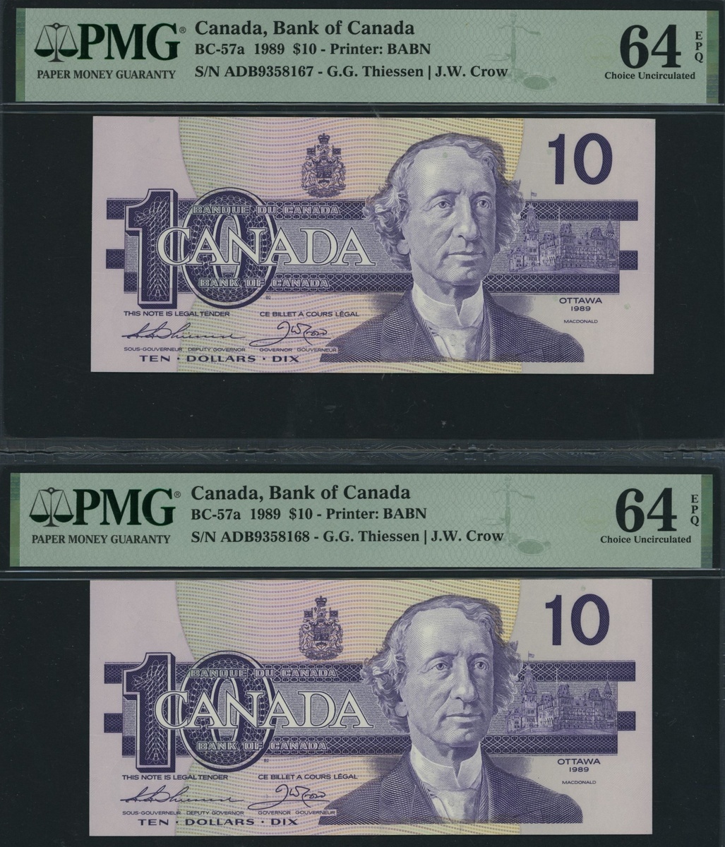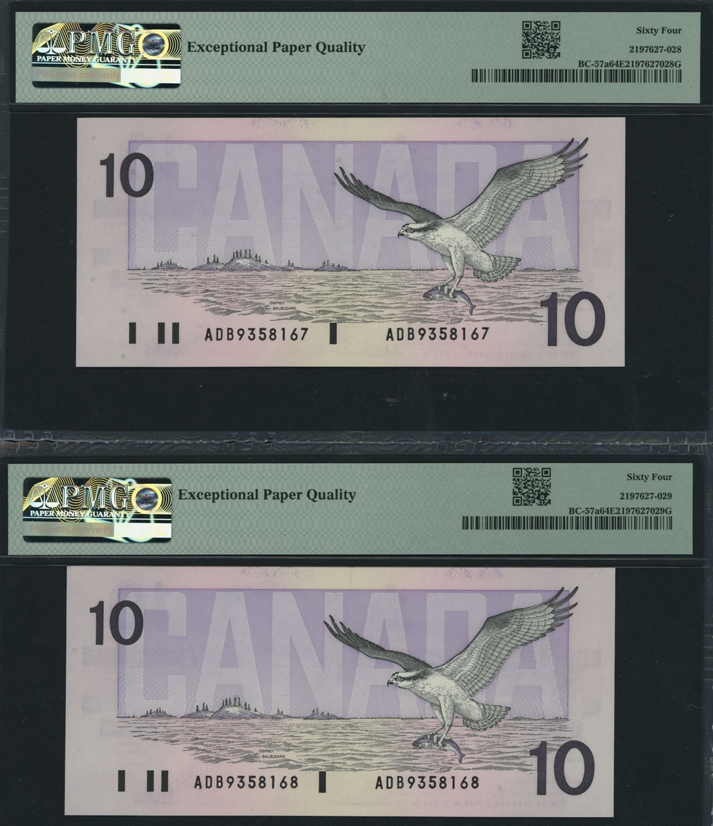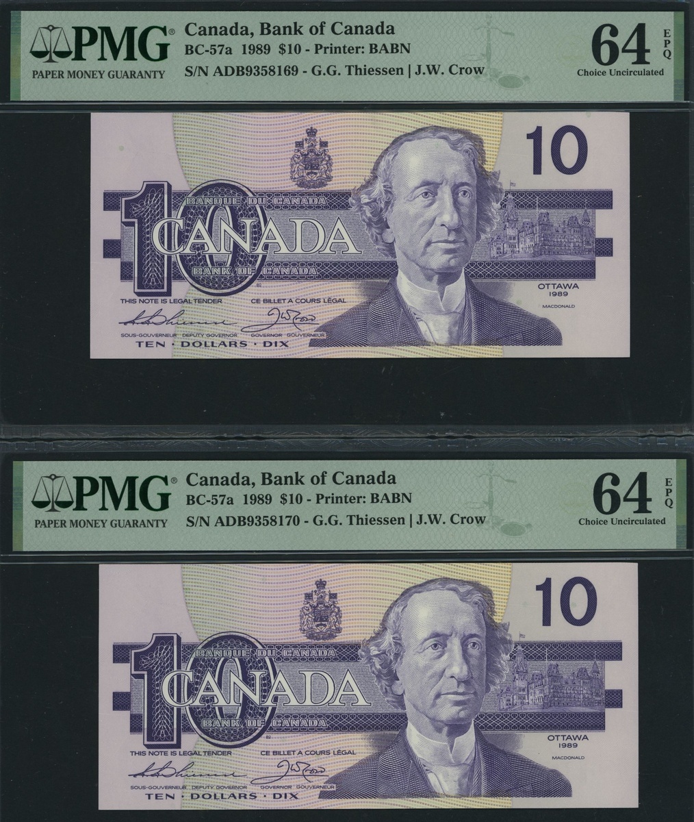 Bank of Canada, [5 notes], consecutive set of $10, 1989, serial number ADB9358167, 68, 69, 70, 71, (Pick 96, BC-57a), all in PMG holders 64 EPQ Choice Uncirculated (5 notes)