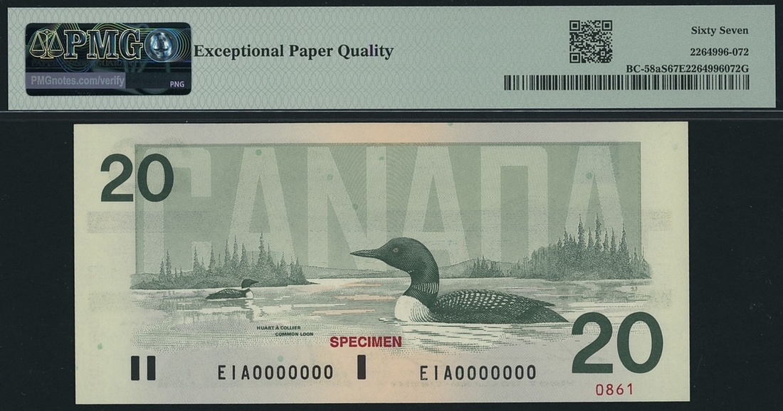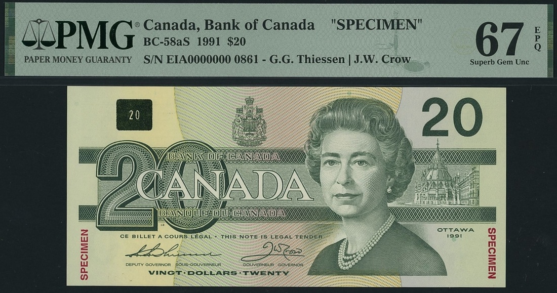 (x) Bank of Canada, [Top Pop] specimen 20 Dollars, 1991, serial number EIA0000000 0861, (Pick 97s, BC-58aS), in PMG holder 67 EPQ Superb Gem Uncirculated, tied for Finest graded on PMG census