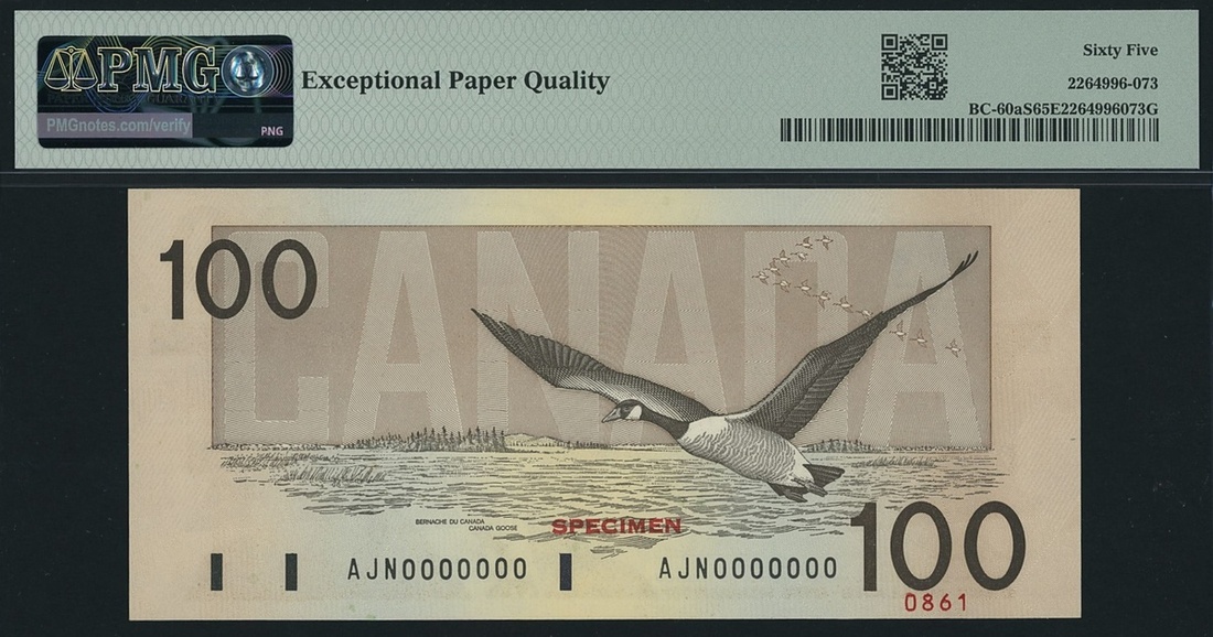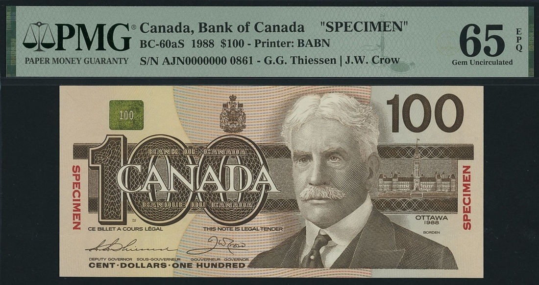 (x) Bank of Canada, specimen 100 Dollars, 1988, serial number AJN0000000 0861, (Pick 99s, BC-60aS), in PMG holder 65 EPQ Gem Uncirculated