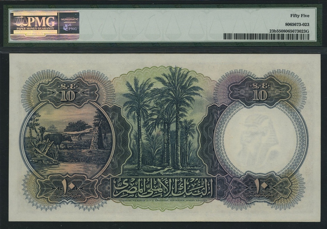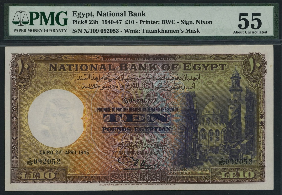 (x) National Bank of Egypt, 10 Egyptian Pounds, Cairo, 21st August 1945, serial number X/109 092053, (Pick 23b, BNB 122c), in PMG holder 55 About Uncirculated