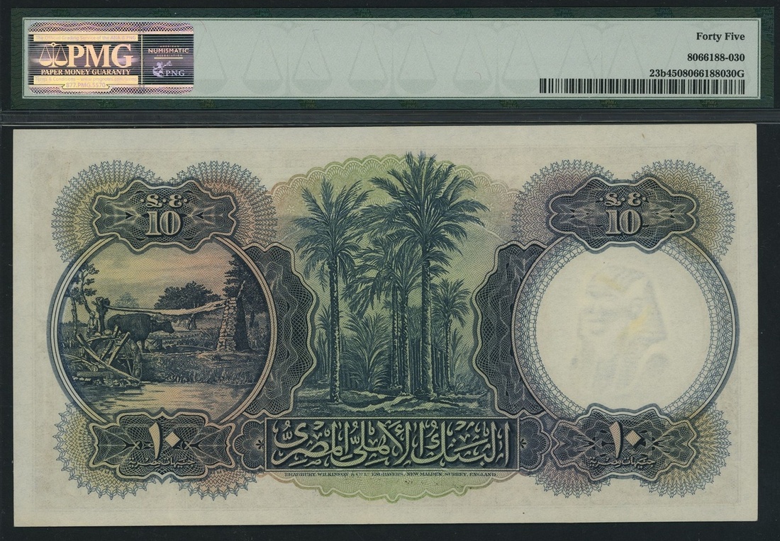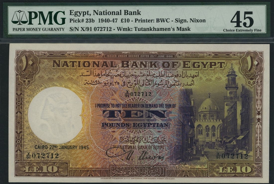 (x) National Bank of Egypt, 10 Egyptian Pounds, Cairo, 22nd January 1945, serial number X/91 072712, (Pick 23b, BNB 122b), in PMG holder 40 Choice Extremely Fine
