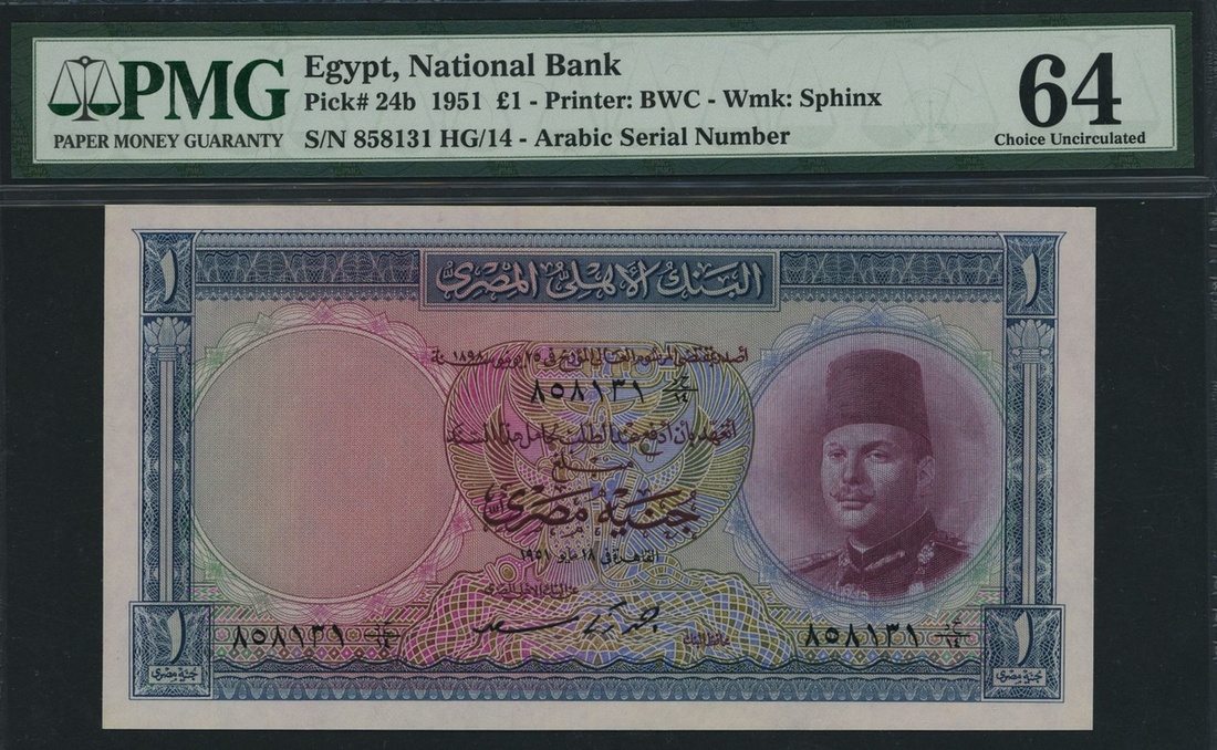 (x) National Bank, Egypt, £1, 1951, serial number 858131 HG/14, (Pick 24b, BNB 123), in PMG holder 64 Choice Uncirculated