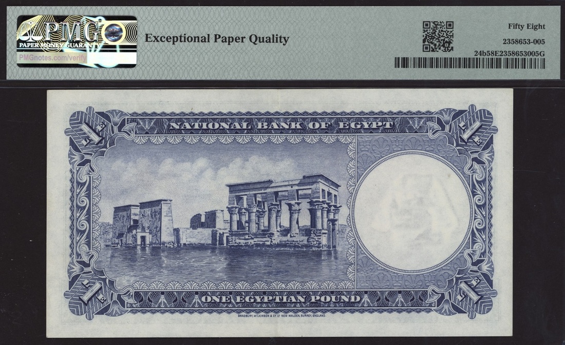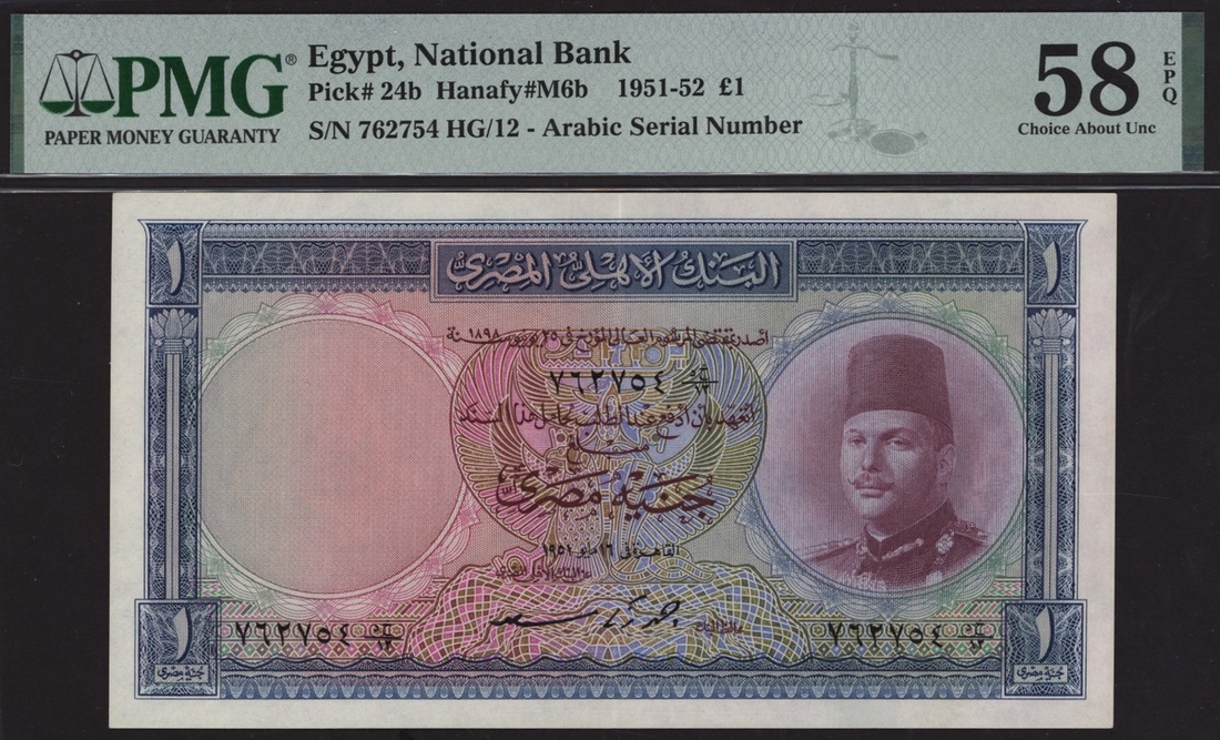 (x) National Bank of Egypt, 1 Egyptian Pound, 1951, serial number 762754 HG/12, (Pick 24b, BNB 123b), in PMG holder 58 EPQ Choice About Uncirculated