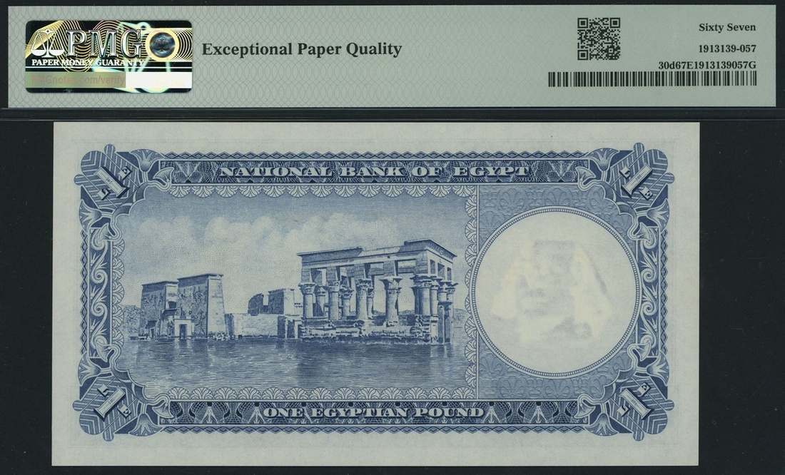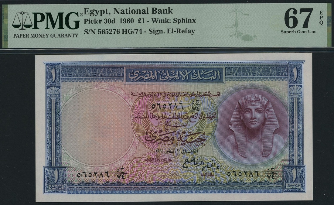 (x) National Bank of Egypt, 1 Egyptian Pound, 1960, serial number HG/74 565276, (Pick 30d, BNB 130d), in PMG holder 67 EPQ Superb Gem Uncirculated