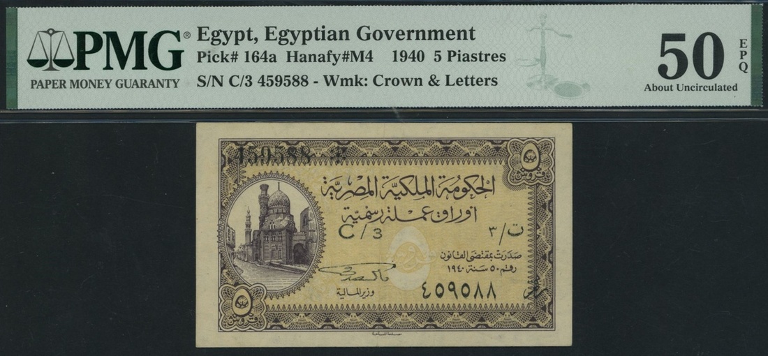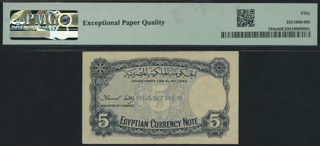 (x) Egyptian Government, Egypt, 5 Piastres, 1940, serial number C/3 459588, (Pick 164a, BNB 210), in PMG holder 50 EPQ About Uncirculated
