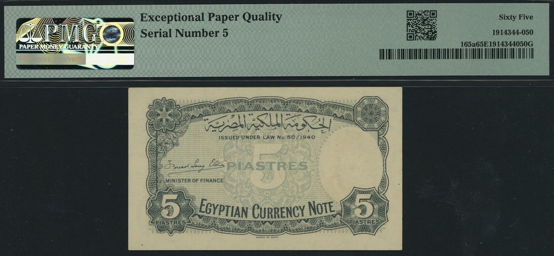 (x) Egyptian Government, Egypt, 5 Piastres, 1940, serial number M/8 000005, (Pick 165a, BNB 212m), in PMG holder 65 EPQ Gem Uncirculated
