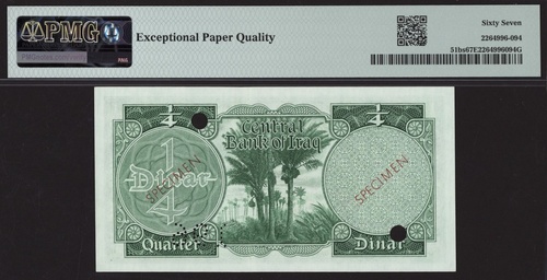 (x) Central Bank Iraq, [Top Pop] specimen 1/4 Dinar, ND (1959), serial number 196, (Pick 51bs), in PMG holder 67 EPQ Superb Gem Uncirculated, the Sole Finest graded on PMG Census