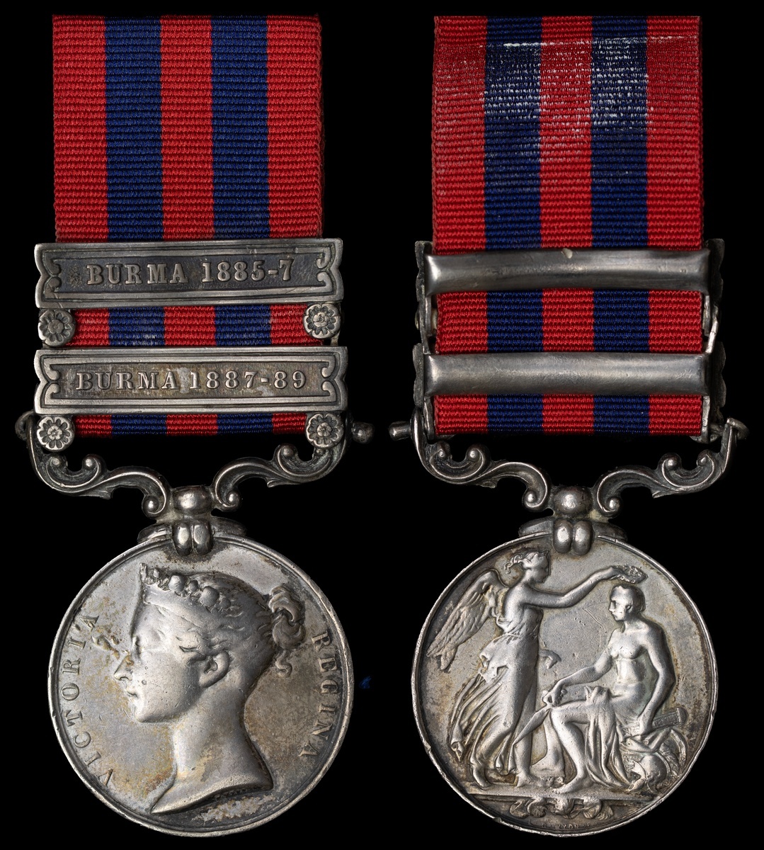 (x) India General Service 1854-95, silver issue, 2 clasps, Burma 1885-7, Burma 1887-89 (2134 Private Luxumon Saloonkay 25th Bo: Infy), replacement unofficial riband roller, soldered suspension, good fine to very fine