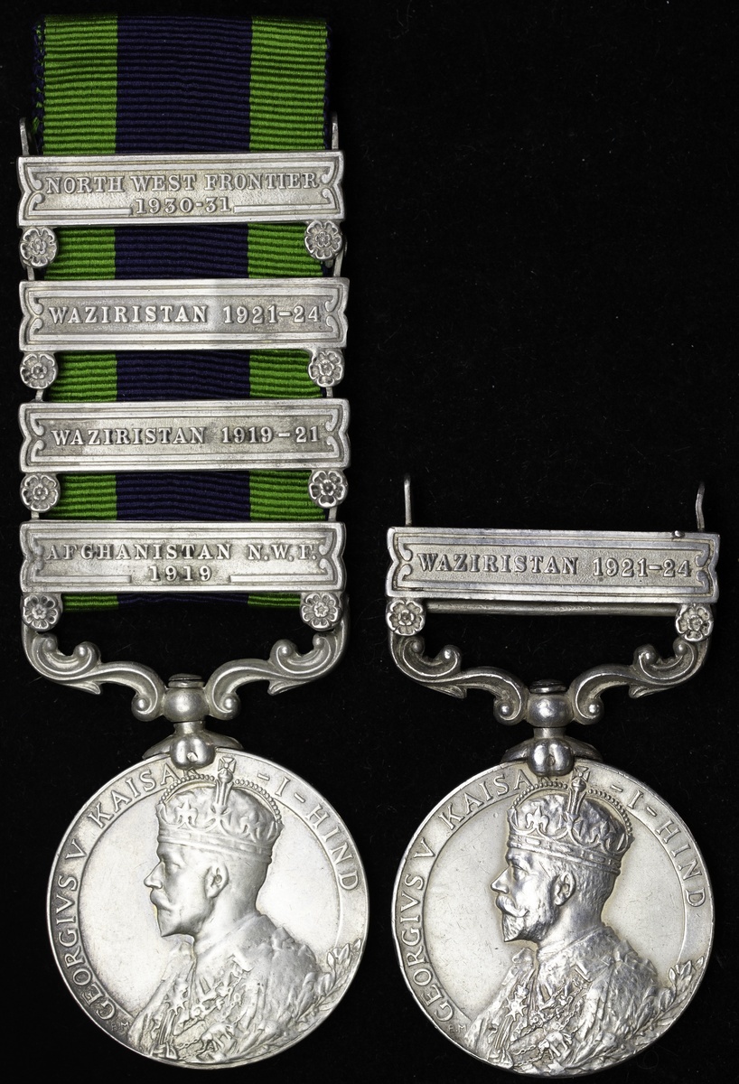 (x) India General Service 1908-35, 4 clasps, Afghanistan N.W.F. 1919, Waziristan 1919-21, Waziristan 1921-24, North West Frontier 1930-31 (3079 Sepoy Karam Khan, 1/76/Pjbs.), suspension slightly loose, edge wear, otherwise very fine