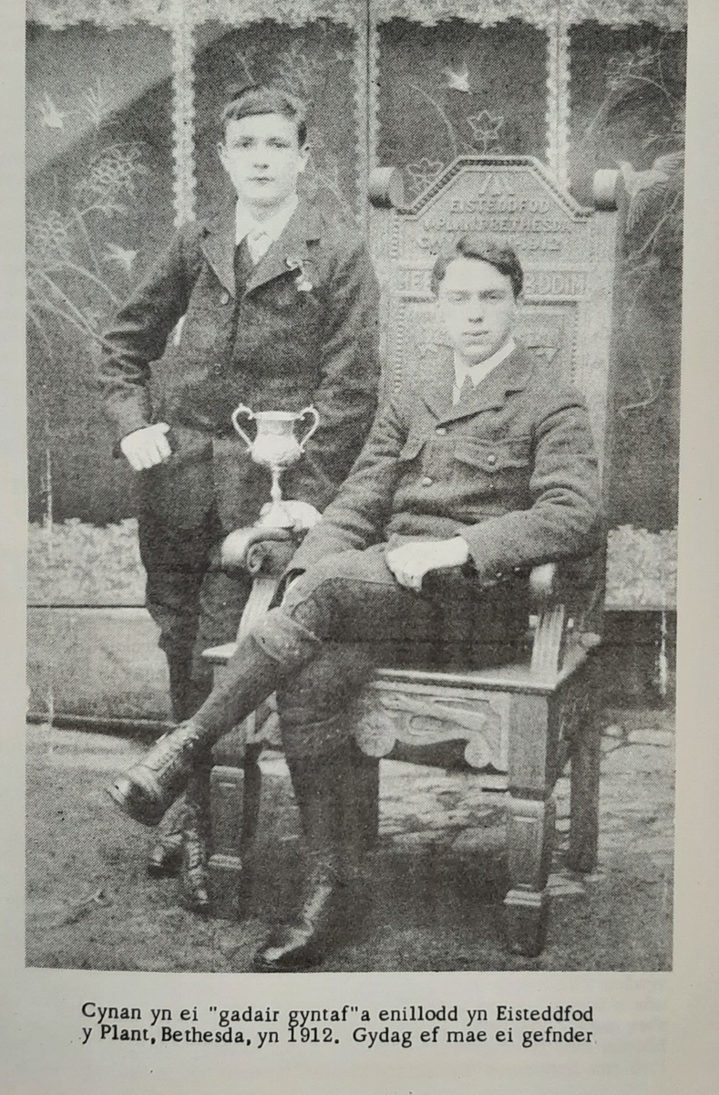 He was also prominent as a National Eisteddfod competitor. In 1921 he won the crown at Caernarfon with his poem ' Mab y Bwthyn ', the story of a young Welshman's experiences in the 1914-18 war. So topical was the subject and so simple and straightforward the style and the versification that the poem attained immediate popularity. The subject of Cynan's second prize poem, ' Yr Ynys Unig ' (Mold 1923), the story of Father Damien's mission to the lepers, made this an equally popular composition. His third crown poem, ' Y Dyrfa ' (Bangor 1931), described a rugby match, the first time such a topic was attempted. The influence of contemporary English poets, especially John Masefield and J.C. Squire, is evident in these eisteddfodic poems, but it has been so thoroughly assimilated as to make the poems completely and distinctively Welsh. In the Pontypool eisteddfod in 1924 Cynan was awarded the chair for a poem ' I'r Duw nid adwaenir ', which is a unique achievement in that the poem is in the metre known as 'tri thrawiad', which is not one of the recognised strict metres. He also adjudicated many times at the National Eisteddfod.'
