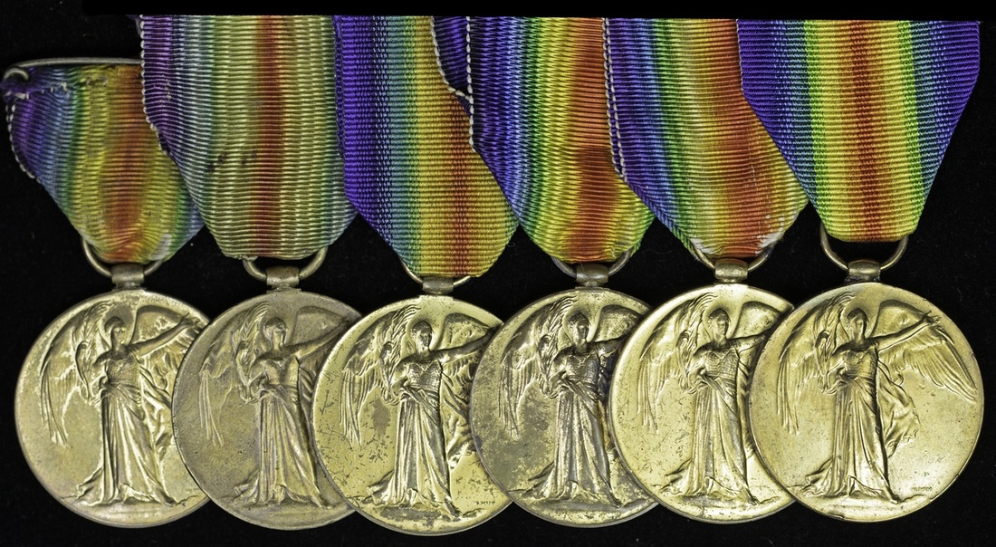 (x) Victory Medal 1914-19 (171432 Spr. F. Jones. R.E.; 139923 Spr. H. Jones. R.E.; 238454 Spr. H. T. Jones. R.E.; 57979 Pnr. J. Jones. R.E.; 75630 Spr. T. H. Jones. R.E.; 104822 Sjt. W. Jones. R.E.), some with contact wear and edge bruising, one polished, nearly very fine to very fine (6)