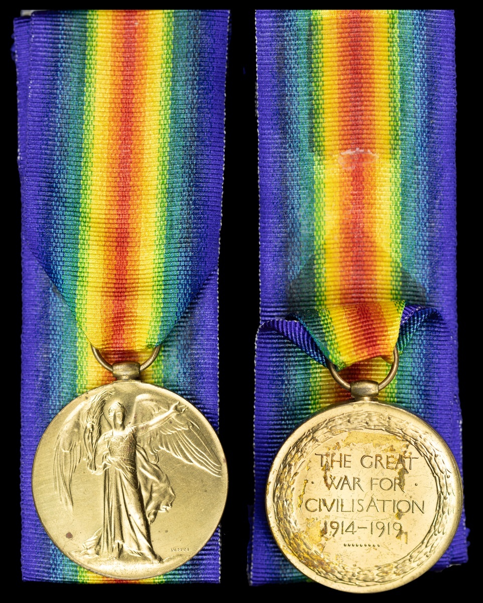 The Victory Medal to Second Lieutenant A. O. Bigg-Wither, Royal Flying Corps, who survived a practice flight crash in a Nieuport Scout on 9 May 1917 but who later was killed during an exhibition flight at King's Lynn on 2 May 1926