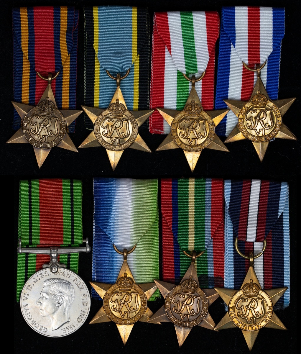Atlantic Star; Air Crew Europe Star copy; Arctic Star copy; Pacific Star; Italy Star; Burma Star; France and Germany Star; Defence Medal 1939-45; together with a King's Badge, very fine overall (9)