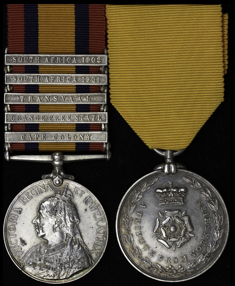 Queen's South Africa 1899-1902, 5 clasps, Cape Colony, Orange Free State, Transvaal, South Africa 1901, South Africa 1902 (32451 Pte. W. Shepherd. 11th Coy. Imp: Yeo:); Yorkshire Imperial Yeomanry Medal 1900-1902 (32451 Pte.W Shepherd.), tarnished, very fine (2)