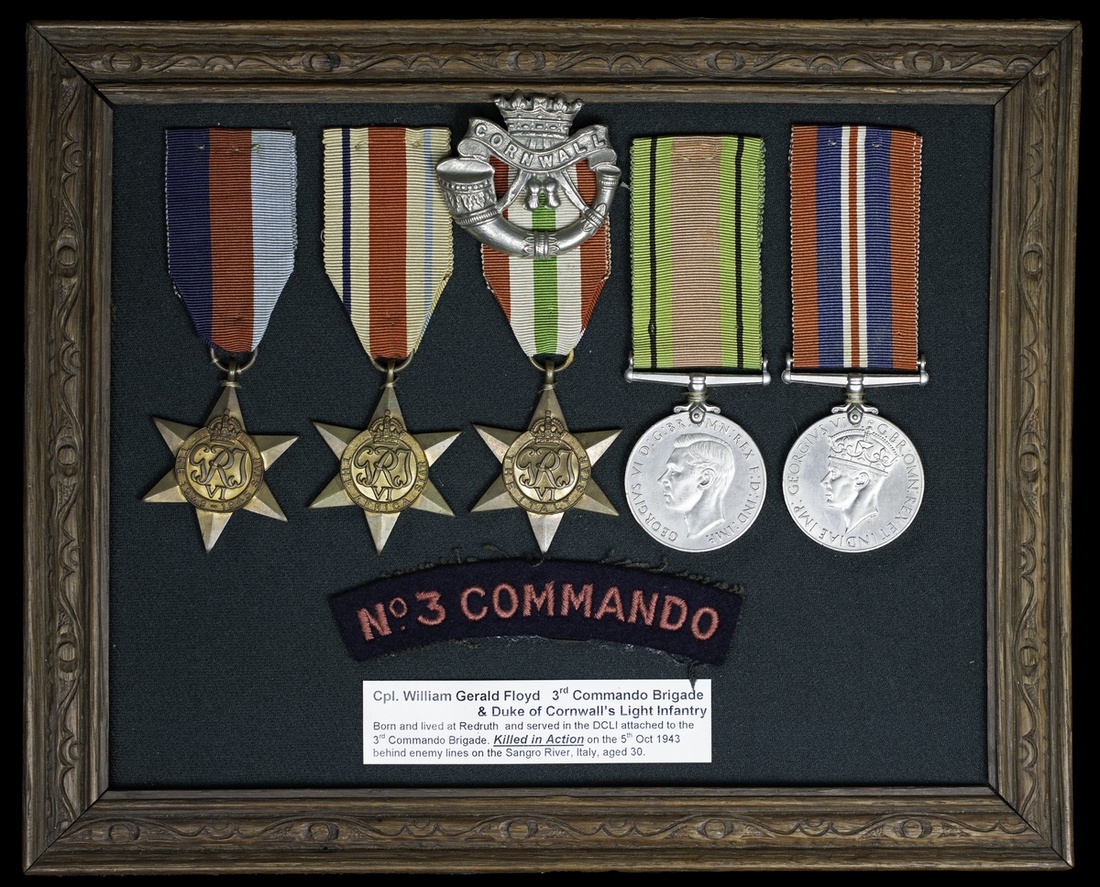 1939-45 Star; Africa Star; Italy Star; Defence and War Medals 1939-45, with Condolence slip in the name of 'Cpl. W. G. Floyd' and in named card box of issue to 'Mr J. R. Floyd, 41 West End, Redruth, Cornwall', good very fine, the medals mounted on an frame with No. 3 Commando shoulder title (Lot)