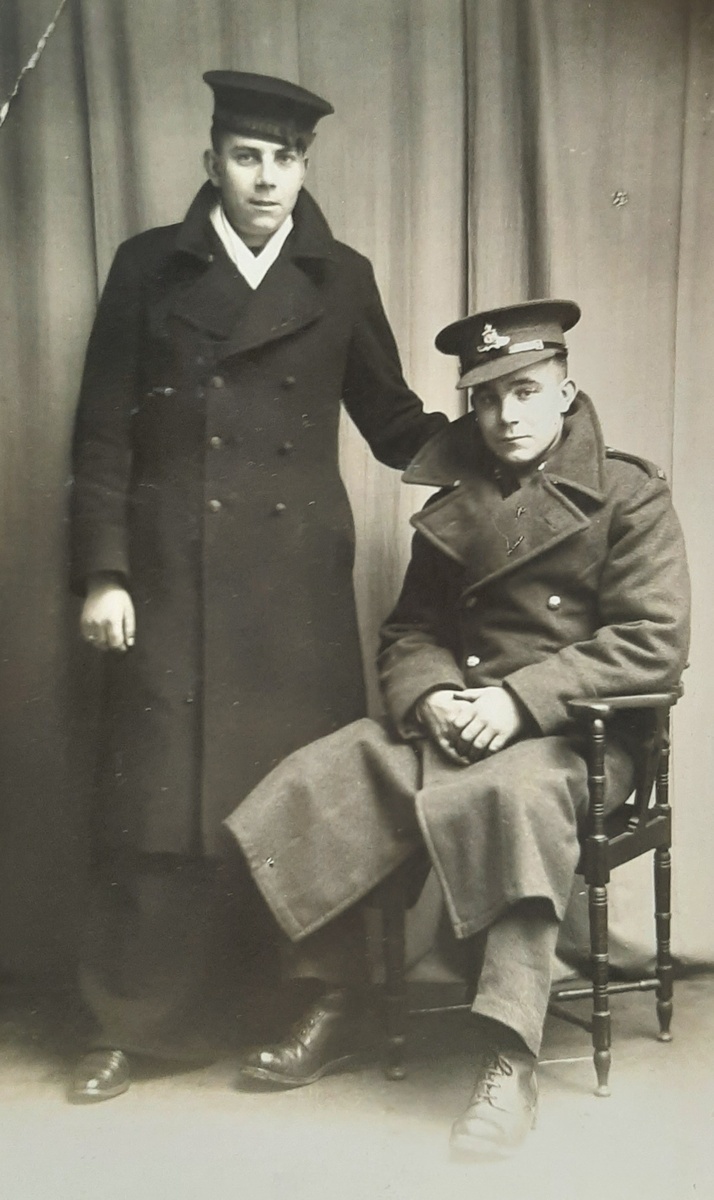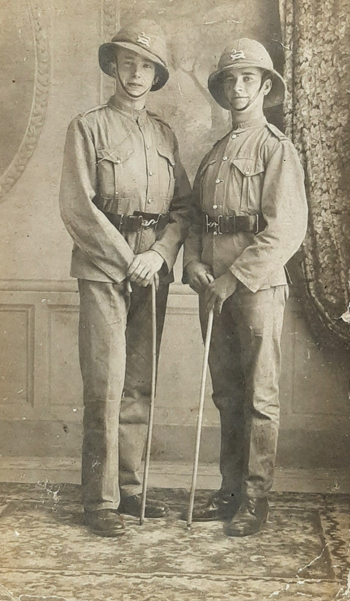 Four postcard photographs of soldiers in unform, some believed to be the recipient and others his father, all either annotated or used as correspondence.
