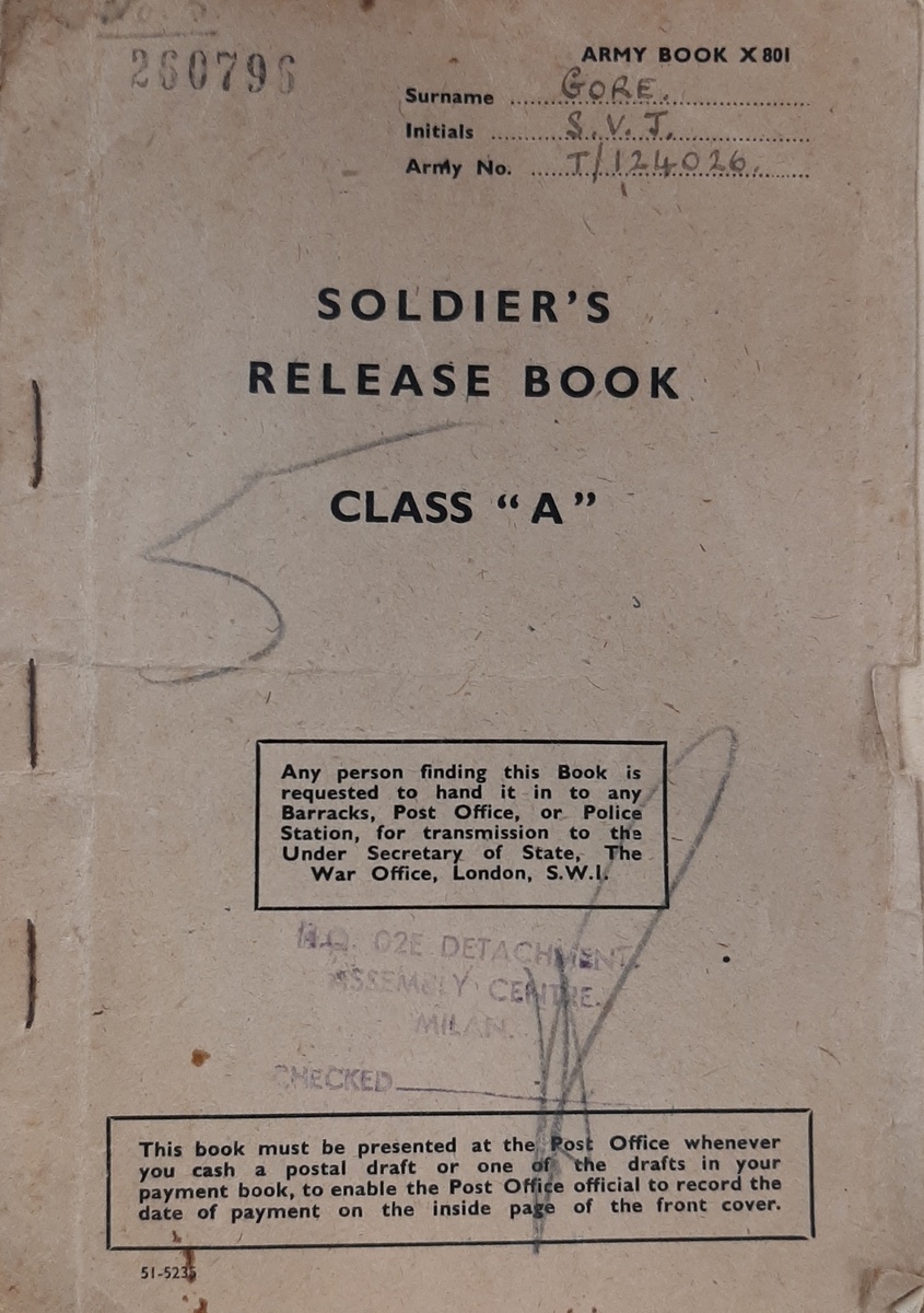 Five: Private S. V. J. Gore, Royal Army Service Corps, who was taken Prisoner of War during the Liberation of Greece in December 1944