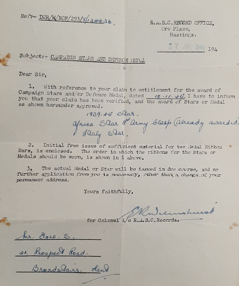 1939-45 Star; Africa Star, clasp, 8th Army; Italy Star; Defence and War Medals 1939-45, mounted recently for wear, sold together with an archive of original material, good very fine (5)