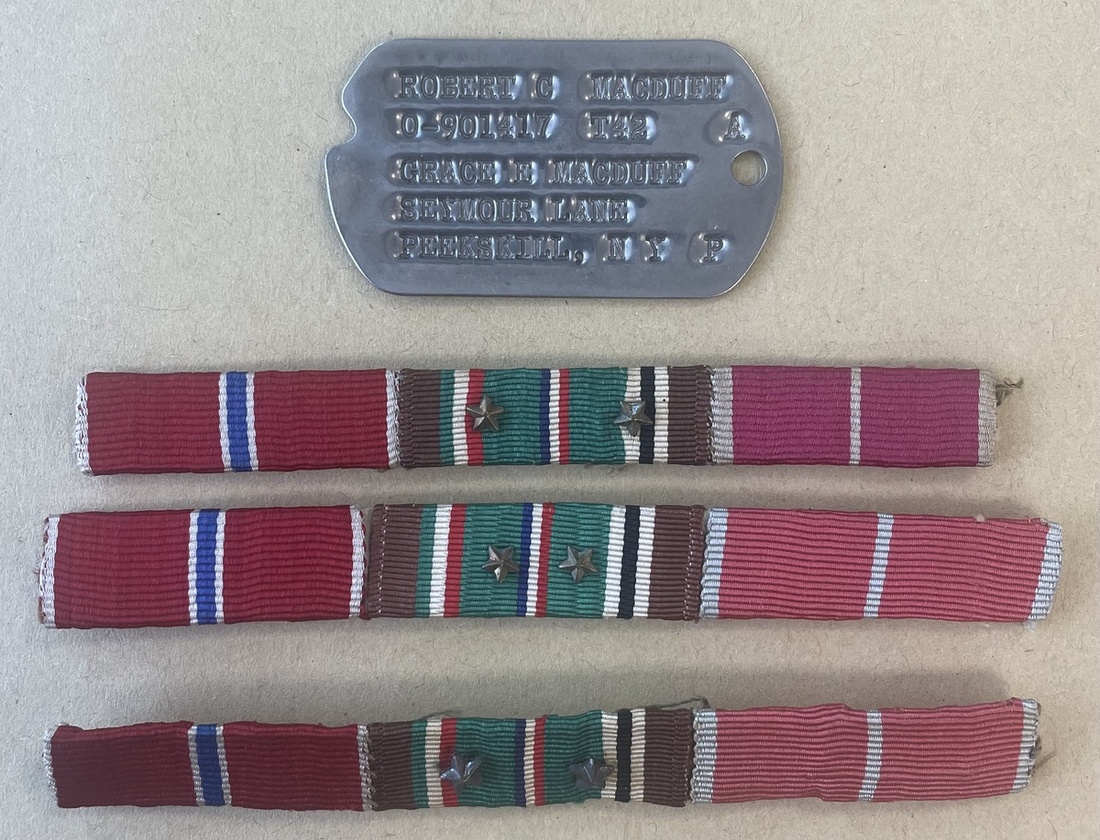 Sold together with his metal identity tag, confirming details as 'Robert C MacDuff O-901417 T42 A, Grace E MacDuff, Seymour Lane, Peekskill, NY P' and three riband bars from his tunic.