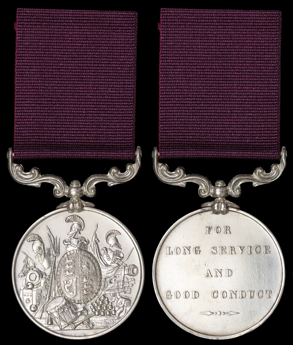 The interesting L.S. & G.C. Medal awarded to Private J. Hallas, 6th Regiment of Foot (Royal Warwickshire Regiment), who qualified for the award despite being marked with a 'D' for desertion, his name appearing 13 times in the Regimental Defaulter's book, and being tried twice by Court Martial