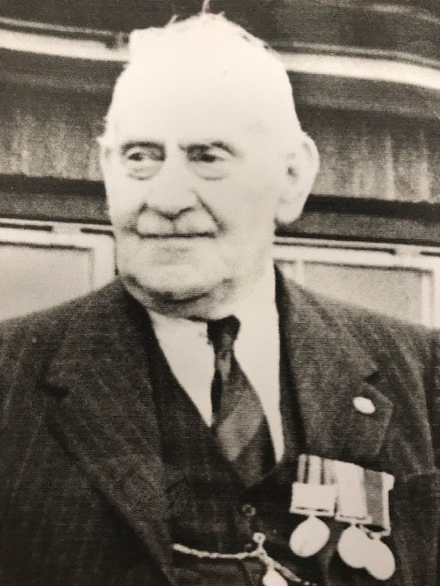 Sold together with a copy photograph of him in later life wearing three medals, the middle one appears to be a Defence Medal but not confirmed.