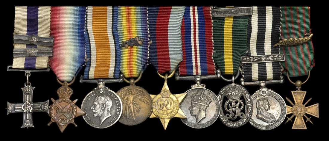 An impressive M.C. and Two Bars mounted group of nine miniature dress medals attributed to Lieutenant Colonel J. A. C. Scott, Royal Army Medical Corps, attached 9th Battalion Durham Light Infantry, who was twice wounded while serving in the Great War