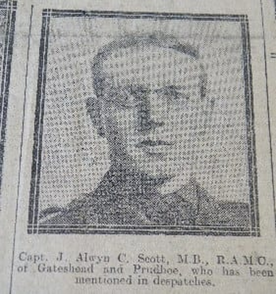 James Alwin Colville Scott was born in Gateshead, Durham on 24 December 1886, the second of three children born to James Scott and his wife Anna. Scott Junior attended Durham University from 1904 to earn a medical degree, for which he received a scholarship, and he later received his qualification and registered as a Doctor in 1912.