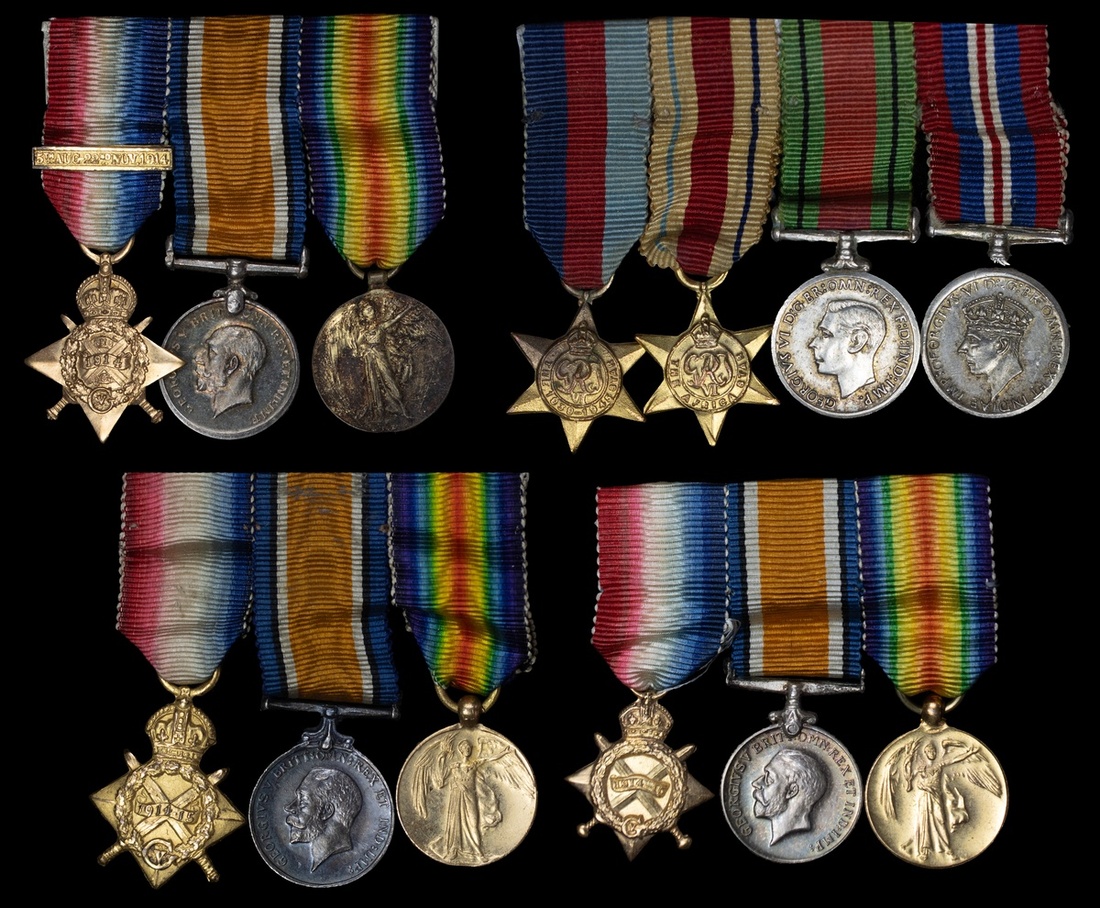 Miniature Medals: 1914 Star with clasp Trio; 1914-15 Star Trios (2); Four: 1939-1945 Star, Africa Star, Defence and War Medals 1939-45, all groups mounted as worn very fine (13)