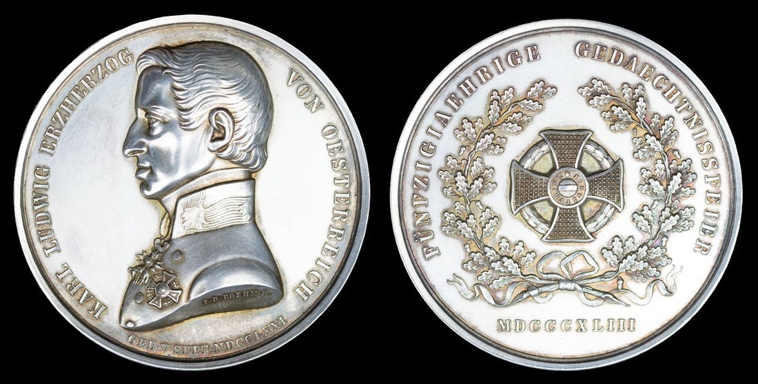 The 1843 Jubilee silver medal was created to commemorate the 50th anniversary of Archduke Karl Ludwig's induction into the Military Order of Maria Theresa. This commemorative medal was presented to all living members of the Order in 1843. Approximately 140 silver medals were issued to Knights of the Order, which included Prince Karl Theodor.
