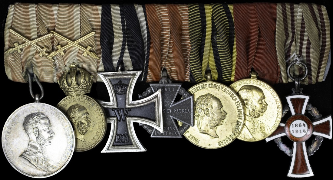 Bravery Medal, silver grade with swords on riband; Military Merit Medal with swords on riband; Prussia, Iron Cross 1914, Second Class; Karl Troop Cross 1916; War Medal 1873; Jubilee Medal 1898; Honour Decoration of the Red Cross, mounted continental-style as worn, the Iron Cross split but complete, otherwise very fine throughout (7)