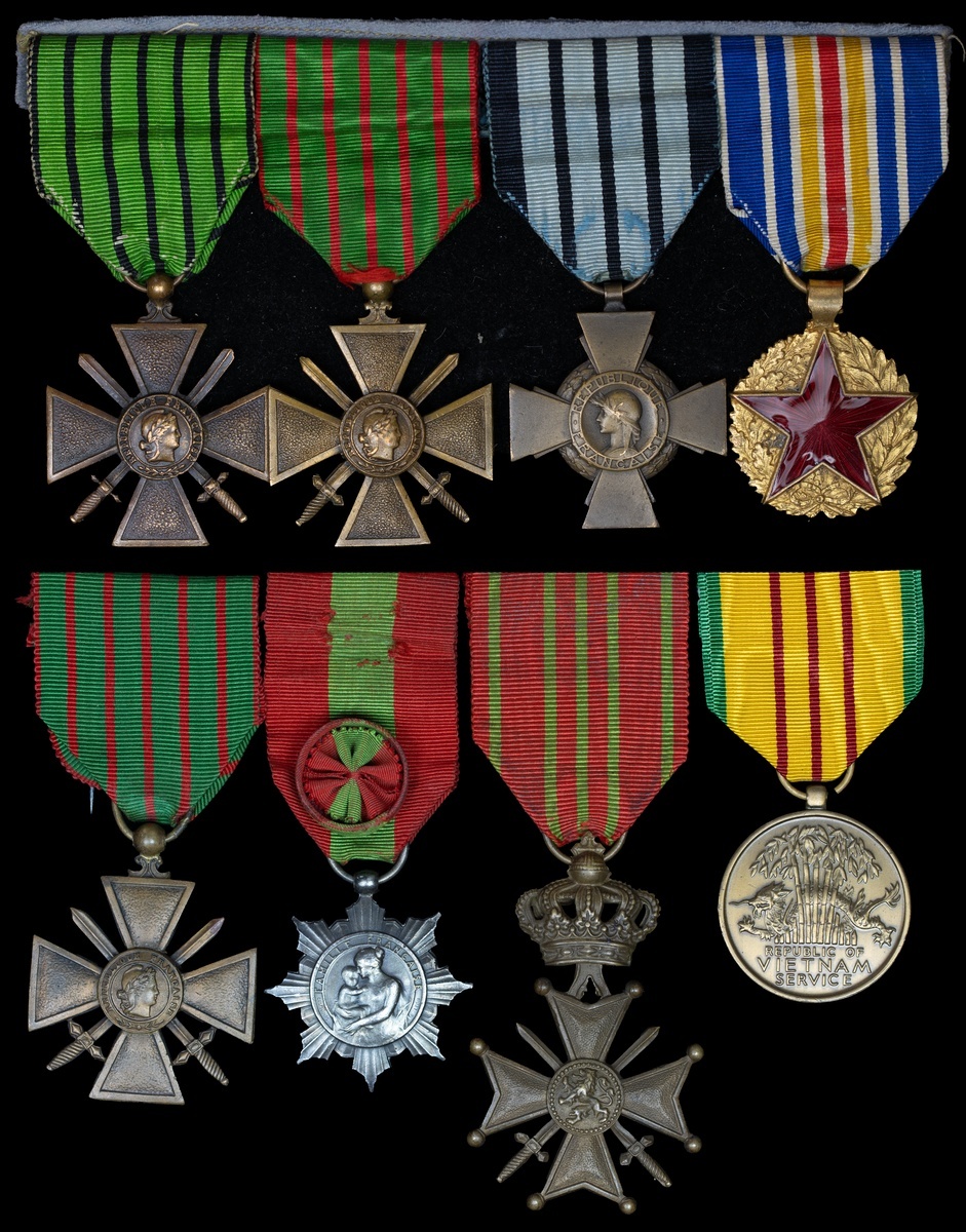 Belgium, Kingdom, Croix de Guerre (1), France, Republic, Croix des Theatres D'Operation Exterieurs, on incorrect riband; Croix de Guerre 1914-18, Croix du Combattant 1939-40; Wound Medal, these four mounted together; Croix de Guerre 1914-18; Medal of the French Family, with Rosette; Union Latine breast Badge, with Rosette, gilt and enamel, cased (7), United States of America, Vietnam Service Medal (1), generally very fine overall (9)